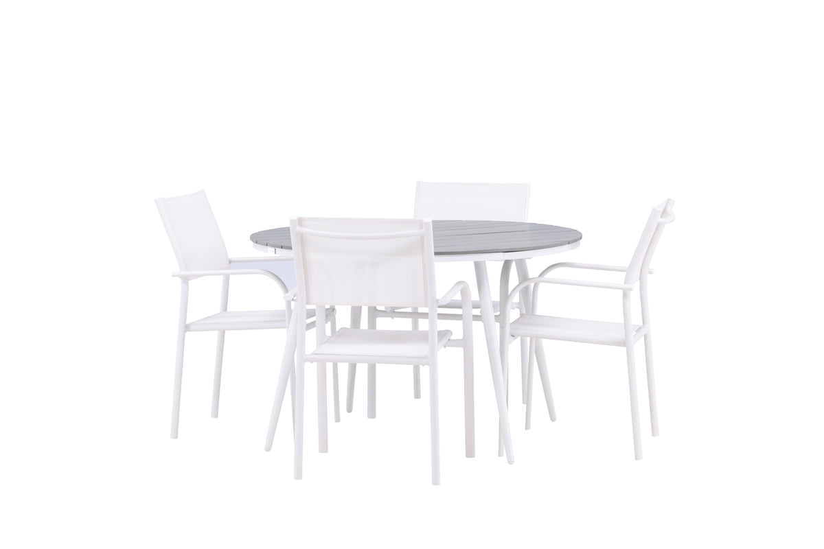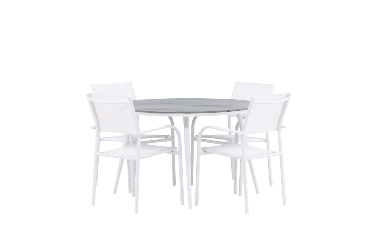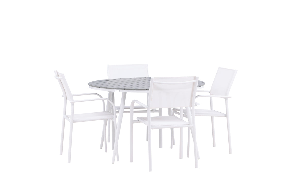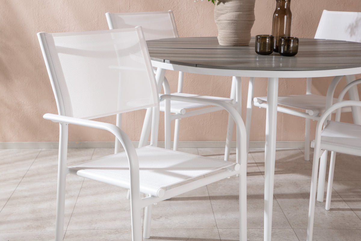 Den perfekta platsen för sommarens alla måltider! Bordet Break har ett klassiskt utförande med en rund bordsskiva i grå aintwood och ett underrede i vit aluminium. Mått: 120ø cm. Här i modern kombination med 4st matstolar från serien Santorini. Stolarna har raka nordiska former med integrerade armstöd i aluminium och en sits i vit textilene. De är även stapelbara för praktisk förvaring. Skapa en mysig matplats på uteplatsen!
