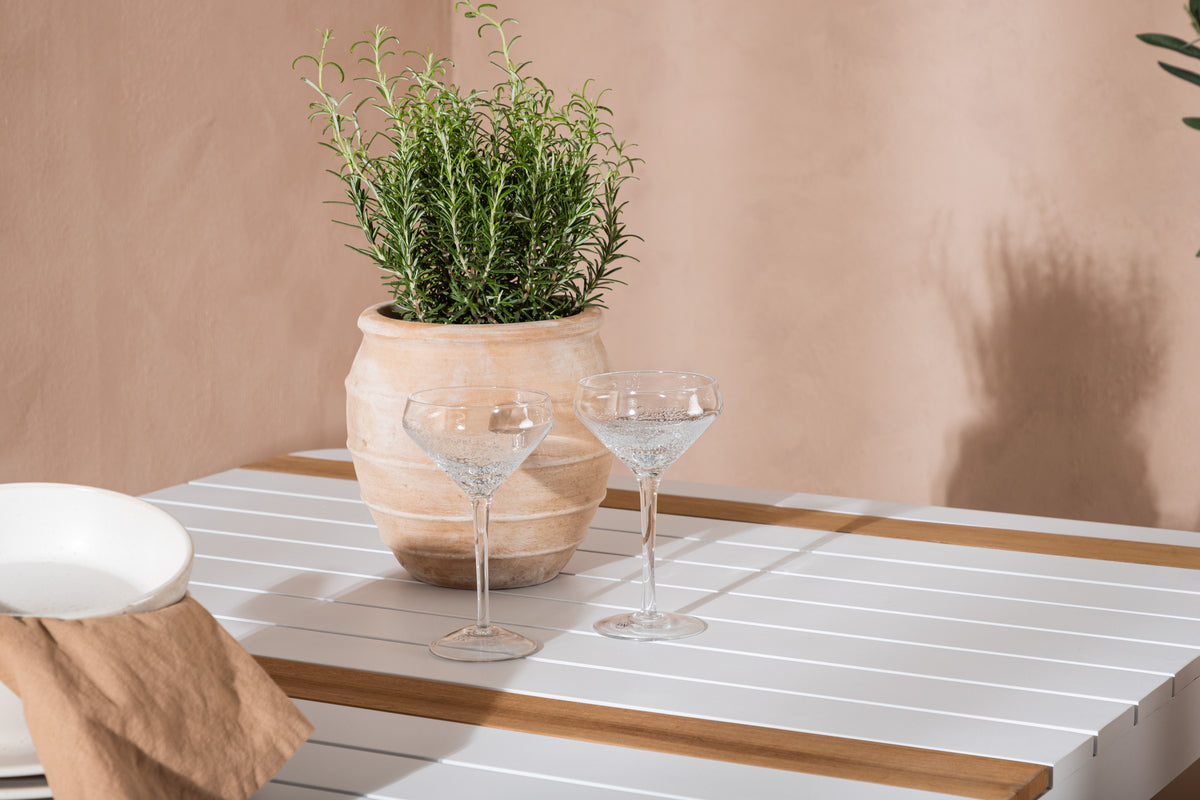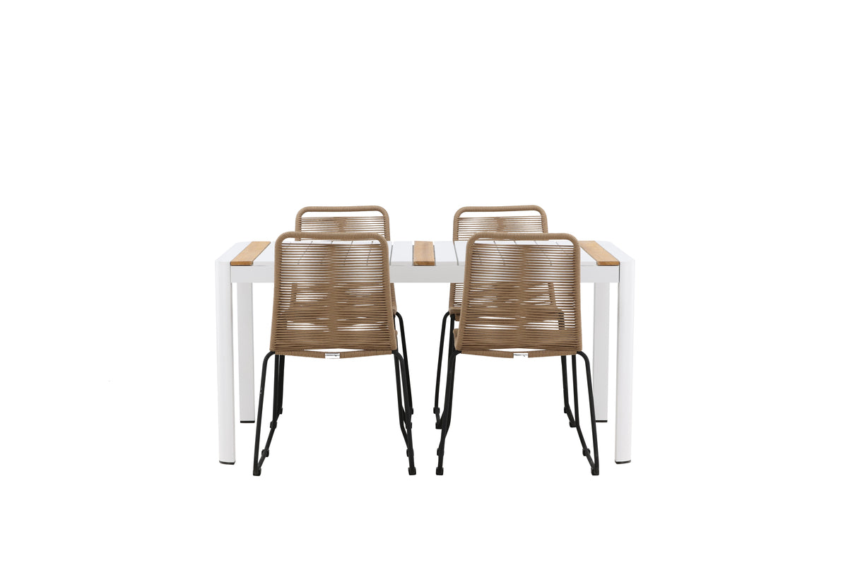 Skapa ett trendsäkert blickfång i varma kulörer som imponerar - den här matgruppen är lika iögonfallande som slitstark! Matbord Togo har ett smakfullt utförande med en rektangulär bordsskiva i vit och träfärgad teak och ett underrede i vit aluminium. Mått: 150x100 cm. Här i modern kombination med lattefärgade matstolar från serien Lindos. Stolarna har stilrent smala ben i svart aluminium och en sits i slitstarkt beige rep. Den jordnära kulören ger ett varmt intryck till möblemanget. Bjud in till många trivsamma måltider framöver!