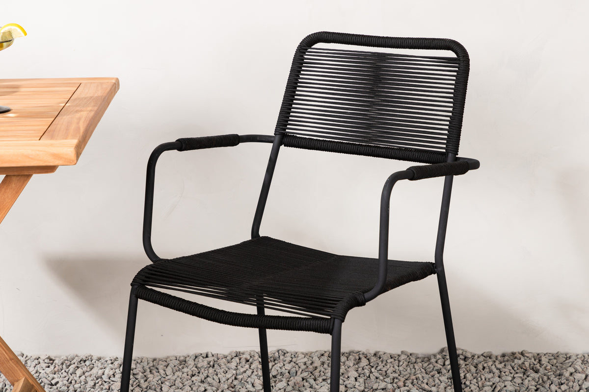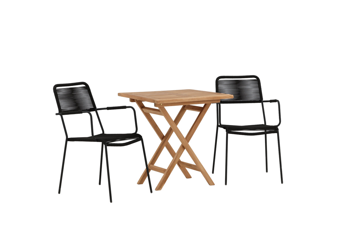 Möblera balkongen eller uteplatsen charmigt för sommarens alla tillfällen! Kenya cafébord är det perfekta bordet i vacker teak som passar utmärkt för sommarens alla utefrukostar och eftermiddagsfikor. Med sitt klassiska utförande och smidiga design är bordet enkelt att matcha och smidigt att flytta runt. Mått: 70x70 cm. Här tillsammans med stolar från serien Lindos i modemedveten design. Stolarna har stilrent smala ben och integrerade armstöd i svart aluminium och en sits i slitstarkt, svart rep. Det här är en inbjudande matgrupp för två som garanterat förlänger trivsamma stunder i sommar!
