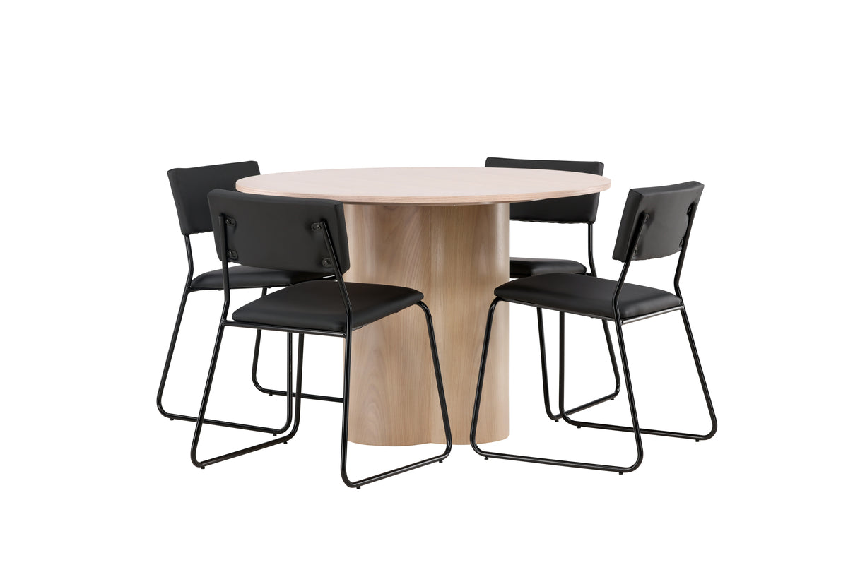 Den perfekta kombinationen av minimalism och robust design! Matbordet från serien Olivia har en genomgående helhetsdesign i vitputsad MDF med en tunn, rund toppskiva och tre cylinderformade ben som sitter samlade under bordets mitt. Kulören har en lätt täcknad på den fanerade skivan vilket synliggör materialets mönster som ger liv och rörelse till bordet. Här tillsammans med 4st moderna matstolar från serien Kenth. Stolen har en rygg och sits i svart polyuretanskinn och polyester samt dekorativt smala stolsben i järn. Skapa en lyxig mittpunkt i hemmets hjärta!