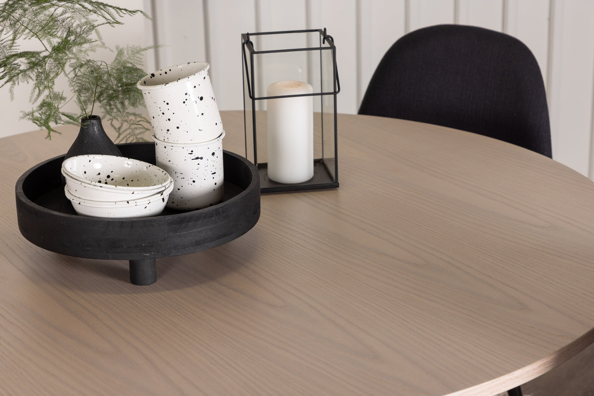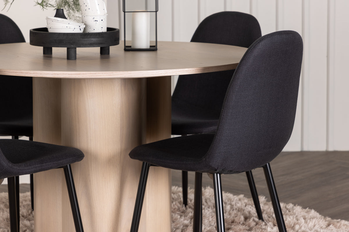 En stilren matgrupp som bjuder in till sociala stunder med nära och kära! Matbord Olivia har en smakfull Skandinavisk design och robust utformning. Bordet har en genomgående helhetsdesign i vitputsad MDF med en tunn, rund toppskiva och tre cylinderformade ben som sitter samlade under bordets mitt. Här tillsammans med 4st matstolar från serien Polar. Stolsryggen är helklädd i stoppat svart polyestertyg och benen är i svart pulverlackerad metall. Skapa ett stilrent blickfång i hemmets hjärta - här hamnar ingen på kanten!