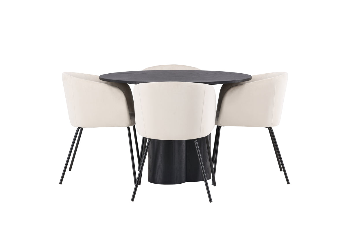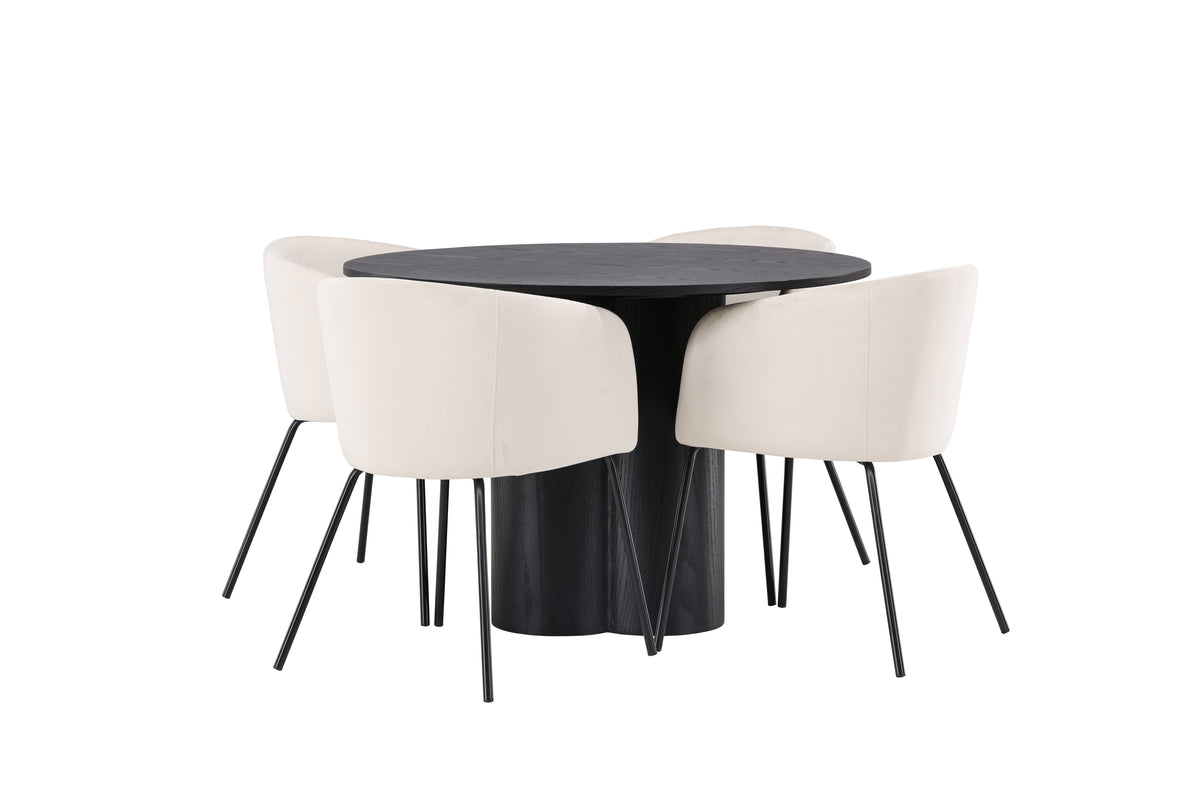 Stilren och smart matgrupp med mjuka former! Det runda matbordet Olivia imponerar med sin Skandinaviska design och robusta utformning. Bordet har en genomgående helhetsdesign i svart MDF med en tunn, rund toppskiva och tre cylinderformade ben som sitter samlat under bordets mitt. Här tillsammans med våra pampiga matstolar Berit. Stolen har en helklädd design med lätt rundad rygg och sits i sammetstyg samt smala stolsben i svart järn. Lika modernt som trivsamt! Bordets mått: 110cm.