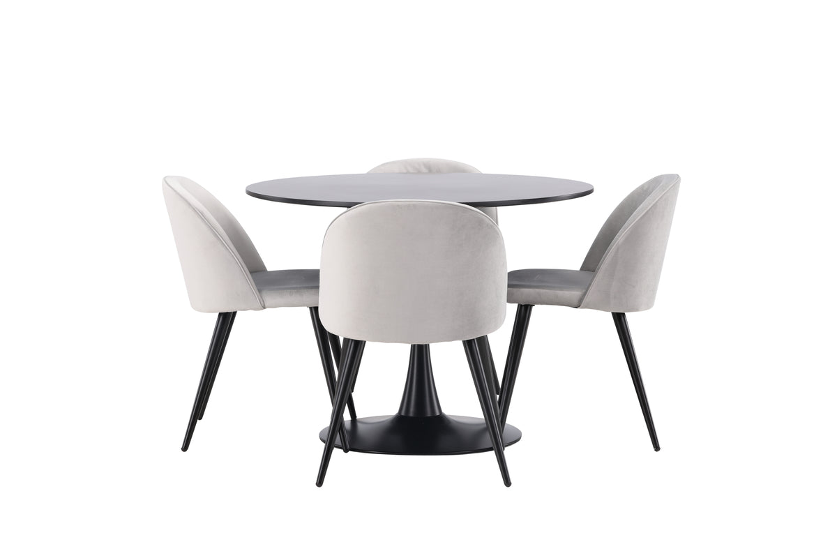 Kombinera behagliga färger med mjuka former! Matbord Glade har en stilren Skandinavisk design med en smäcker trumpetfot i svart stål och en svart bordsskiva i MDF. Här i perfekt kombination med våra gråa matstolar från serien Velvet. Stolen har en helklädd design, ben i svart pulverlackerad metall samt rundad rygg och sits i grått sammetstyg med mjuk stoppning. Här sitter du bekvämt länge! Bordets mått: 100cm.