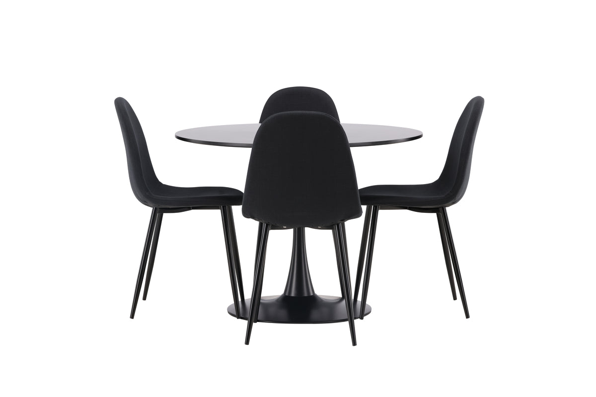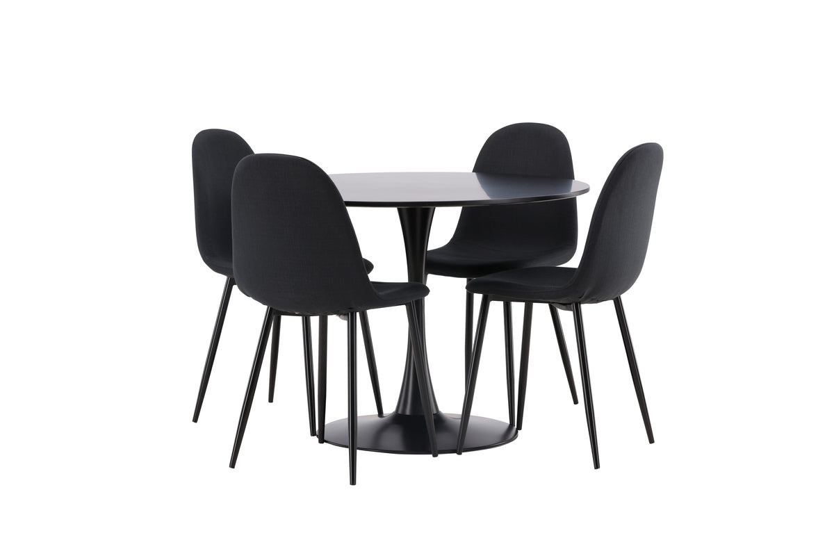 Matbord Glade har en stilren Skandinavisk design med en smäcker trumpetfot i svart stål och en svart bordsskiva i MDF. Här kombineras bordet med svarta matstolar från serien Polar. Stolen har en rundad utformning med klassisk design - lika praktisk som tidlös. Rygg och sits är stoppad i svart polyestertyg och ben i svart pulverlackerad metall. Här får du en matchande, komplett matgrupp till vardagsrummet eller köket! Bordets mått: 100cm.