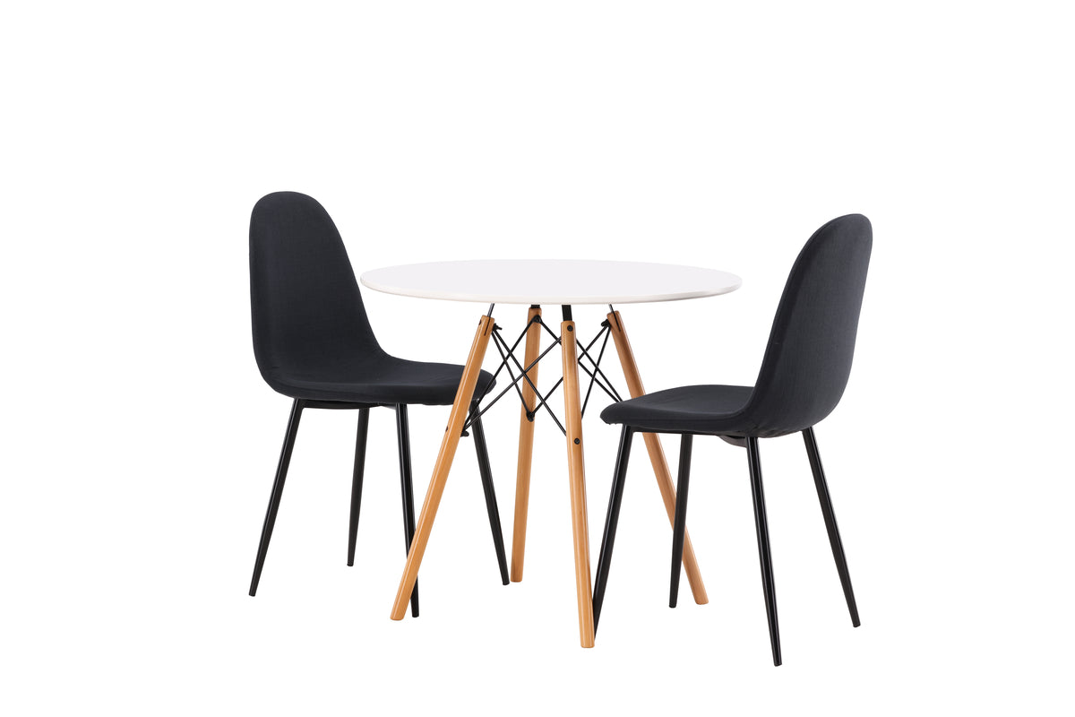 Sitt lika smart som bekvämt! Det runda matbordet Danburi har en klassisk design med en rund bordsskiva i vit MDF och lätt utsvängda ben i bokträ med dekorativa detaljer i svart stål. Här i fantastisk kombination med svarta matstolar från serien Polar. Stolen har en helklädd design, ben i svart pulverlackerad metall samt rundad rygg och sits i svart polyestertyg med mjuk stoppning. Den här gruppen passar utmärkt i det mindre köket! Bordets diameter: 60cm.
