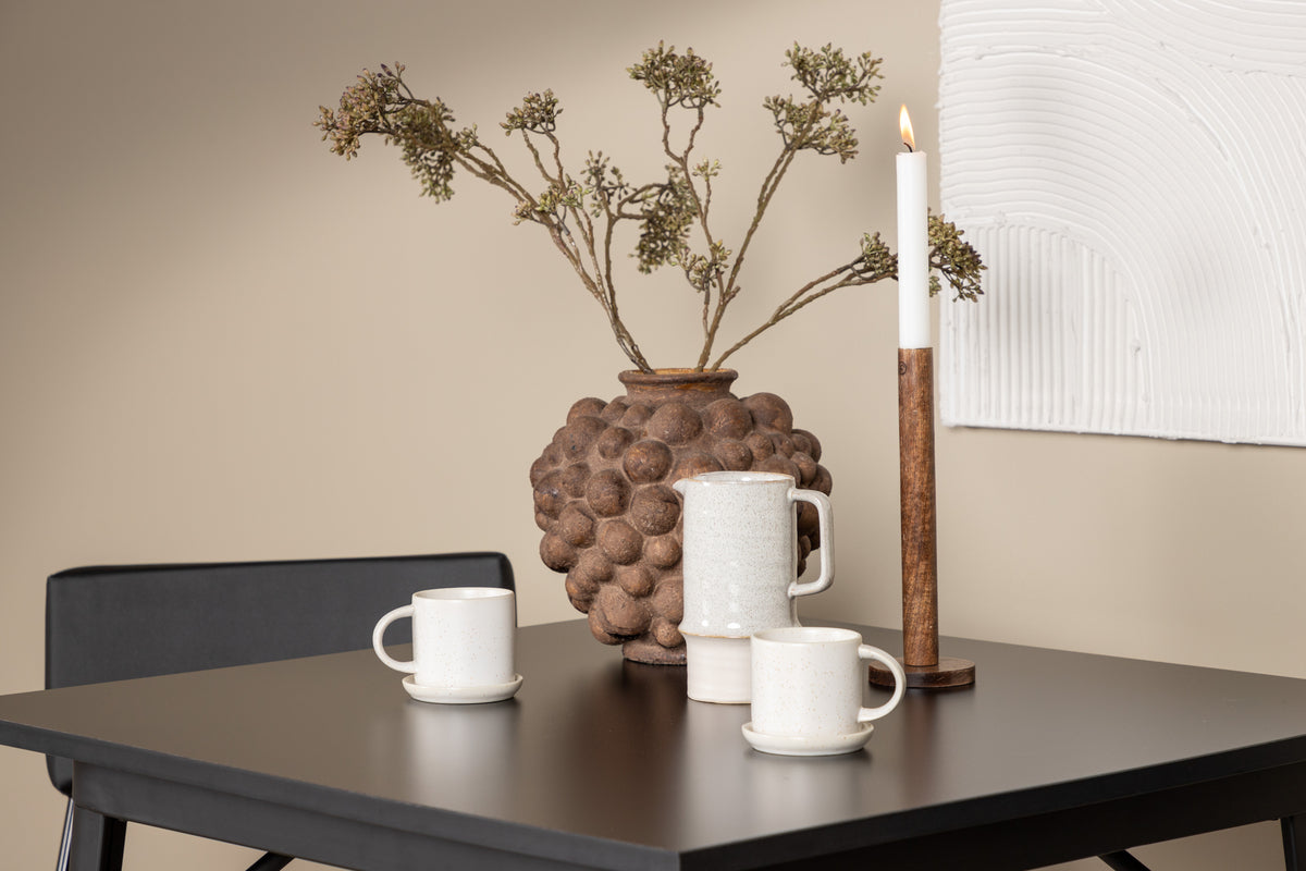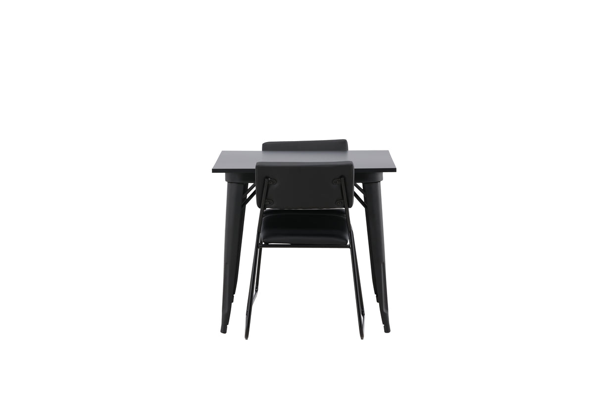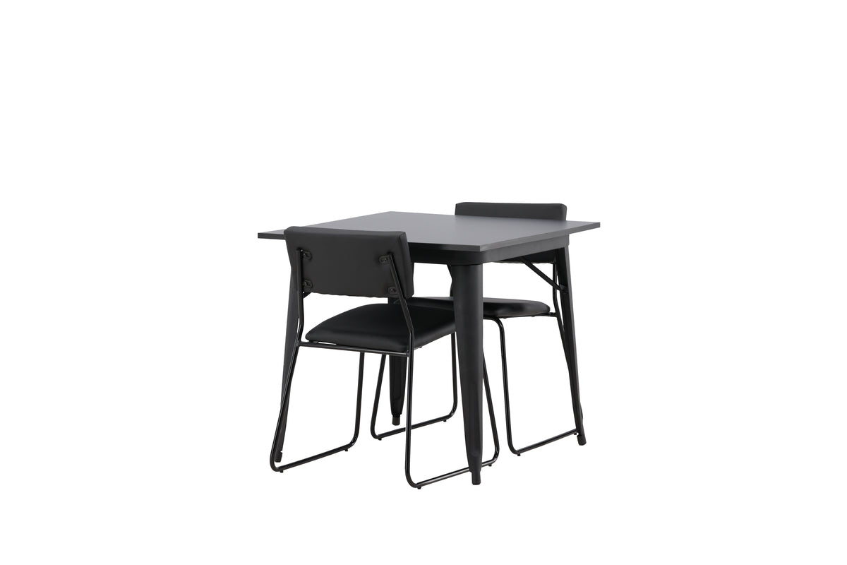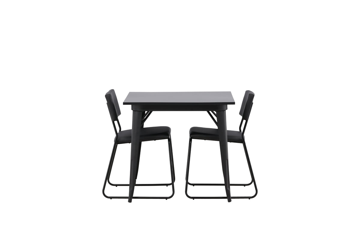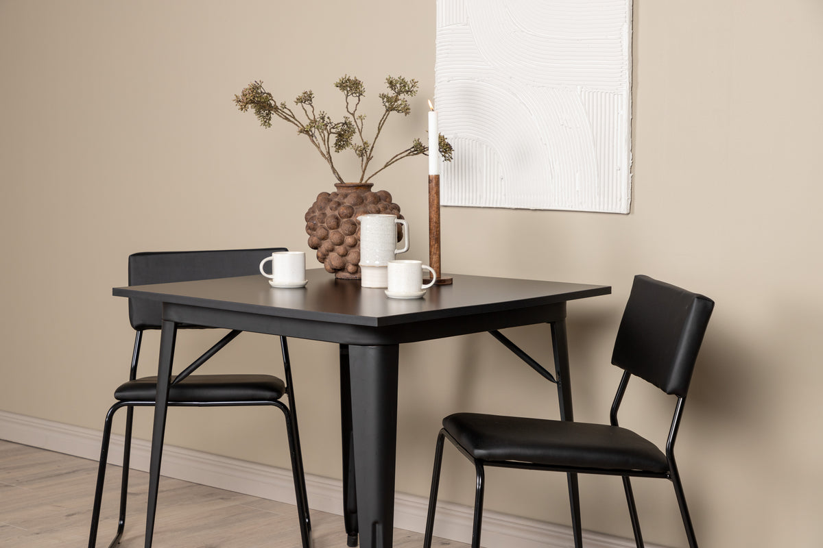En nätt matgrupp som passar perfekt i det mindre köket! Det här matbordet från serien Tempe har en klassisk, kvadratisk utformning och en tidlös svart kulör. Bordsskivan är i svart MDF och bordsbenen i svart metall. Här i smakfull kombination med två matstolar från serien Kenth. Stolen har en minimalistisk, modern design som skapar en luftig känsla i rummet. Rygg och sits är i svart polyuretanskinn och polyester och de smala stolsbenen är i järn. Skapa ett charmigt och modernt blickfång!