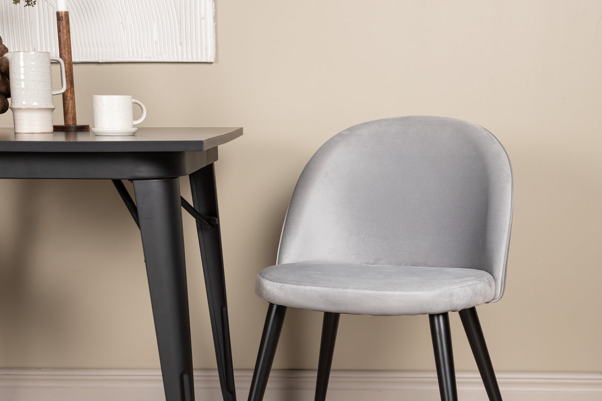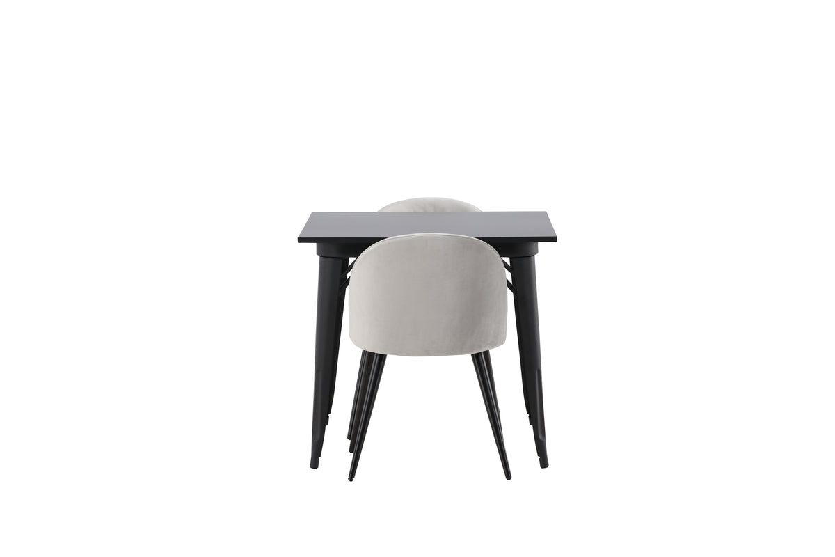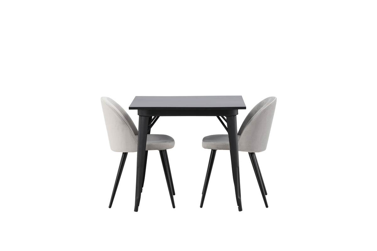 En charmig matgrupp för två - perfekt för det lilla köket! Det här matbordet från serien Tempe har en klassisk, kvadratisk utformning och en tidlös svart kulör. Bordsskivan är i svart MDF och bordsbenen i svart metall. Här i smakfull kombination med två matstolar från serien Velvet i behaglig grå kulör. Den här matstolen har en helklädd design med lätt rundad rygg och sits i mjukt sammetstyg och ben i svart pulverlackerad metall. Sitt bekvämt och stilrent!