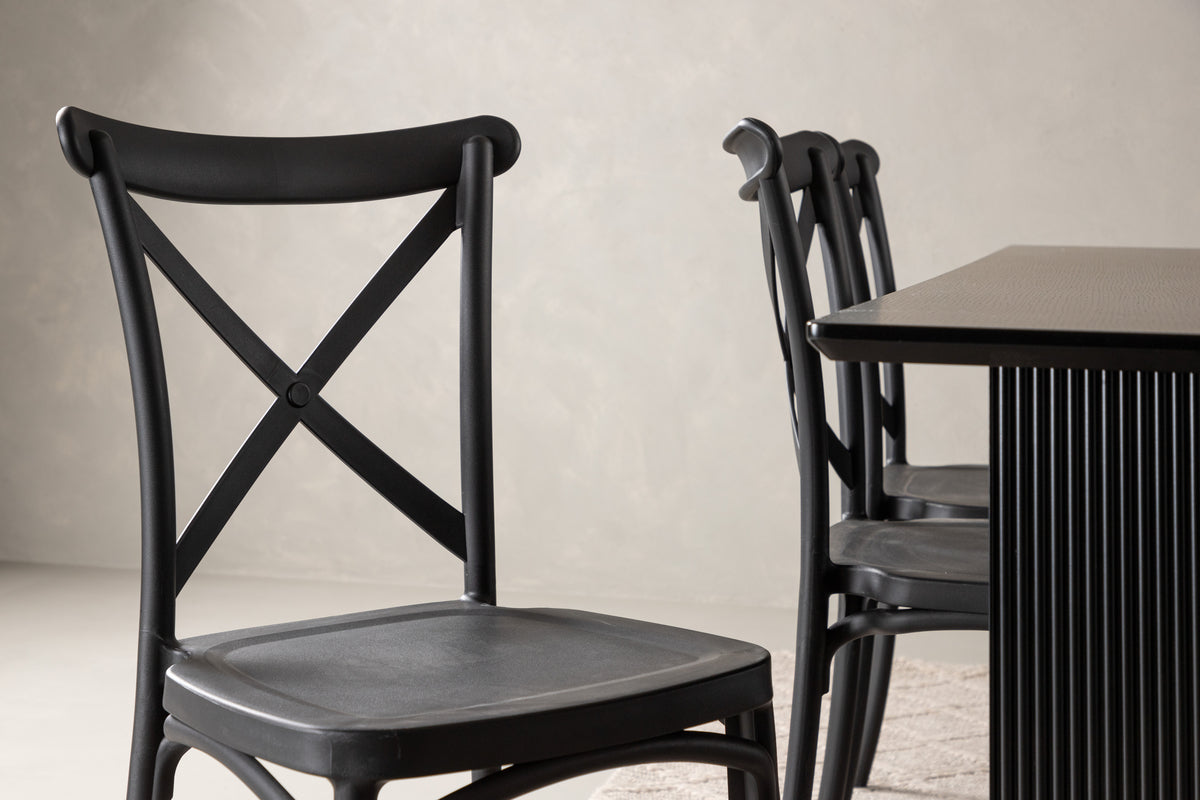 Här kombineras klassisk design och moderna former! Vårt rektangulära matbord från serien Vail har raka nordiska former och är tillverkat i slitstarkt MDF i en sotig svart kulör. Bordsskivan är tunn och balanserar på två bastanta träskivor som utgör underredet - lika snyggt som tåligt. Här tillsammans med matstolar från serien Crosett. Stolarna har en nostalgisk utformning med en kryssad rygg och raka linjer, genomgående tillverkad i svart plast. Här får du en stilren matgrupp att pryda ditt hem med!