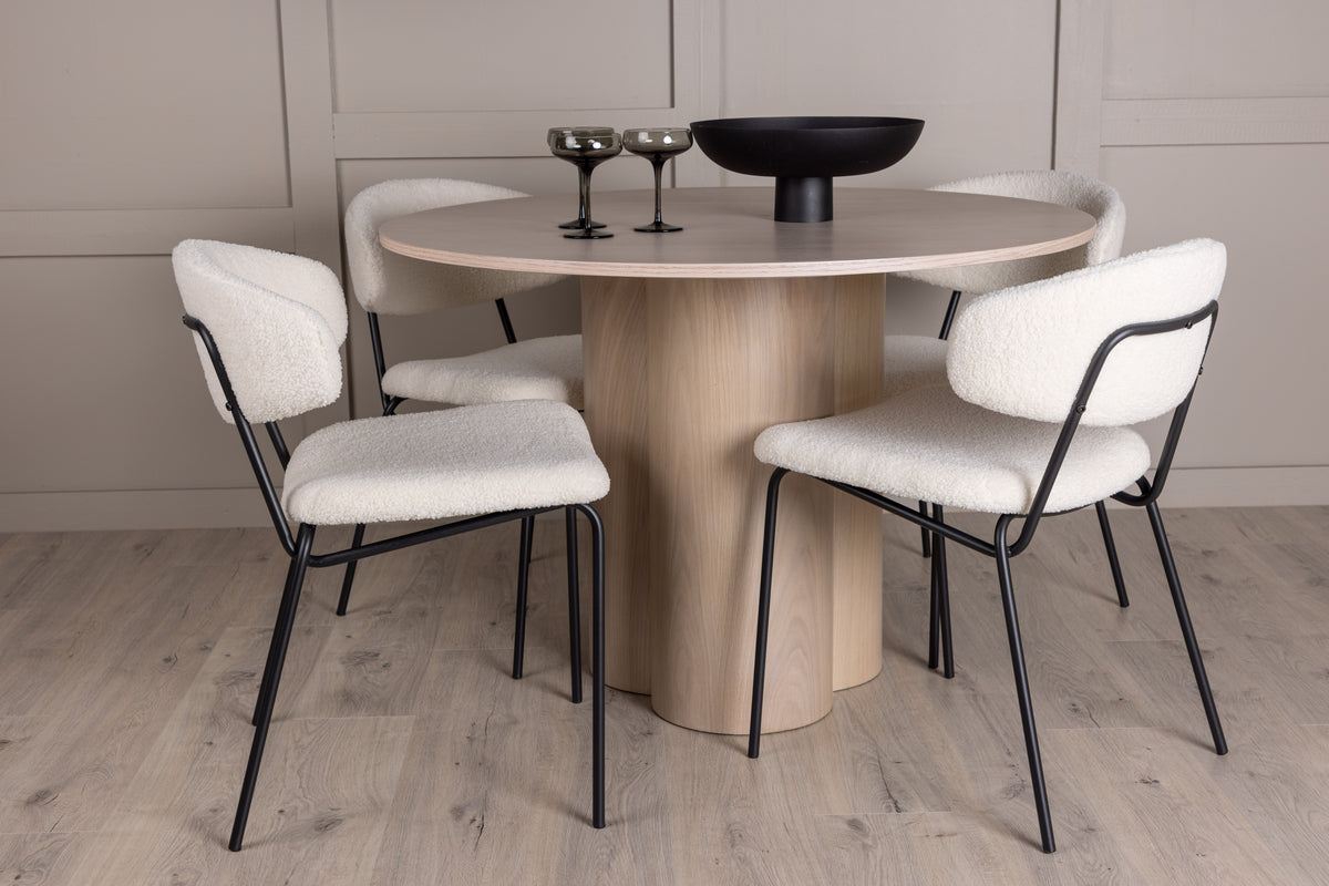 Stilrent, inbjudande och lyxigt! Den här matgruppen imponerar med sin Skandinaviska design och moderna former. Matbordet från serien Olivia har en genomgående helhetsdesign i vitputsad MDF med en tunn, rund toppskiva och tre cylinderformade ben som sitter samlade under bordets mitt. Här tillsammans med 4st matstolar från serien Chico. Stolens smakfulla minimalism kombineras utmärkt med den runda utformningen och smäckra boucletyget i beige kulör. Stolens sits och ryggstöd är stoppat för extra komfort och den smala, svarta stålkonstruktionen är helt i linje med trenderna.