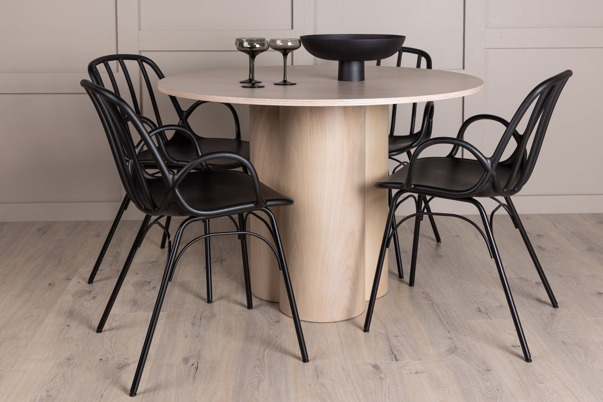 En rund matgrupp som imponerar! Matbord Olivia har en dekorativ, Skandinavisk design som ger ett charmigt och robust intryck. Bordet är i vitputsad MDF med en tunn, rund toppskiva och tre cylinderformade ben som sitter samlat under bordets mitt. Kulören har en lätt täcknad på den fanerade skivan vilket synliggör materialets mönster som ger liv och rörelse till bordet. Här i snygg kombination med mattsolar från serien Dyrön. Lika praktisk som stilren är stolen i svart plast och har en följsam, dekorativ utformning. Låt tiden här bli dagens höjdpunkt!