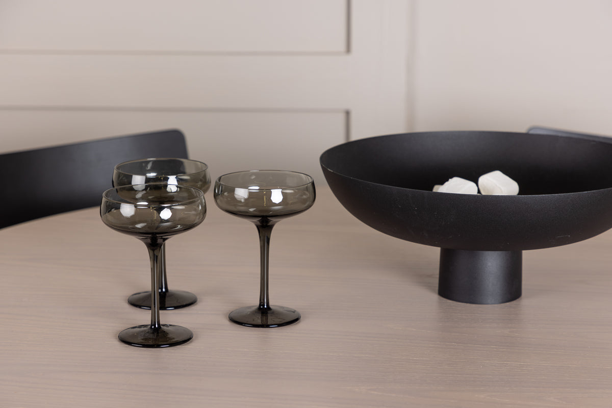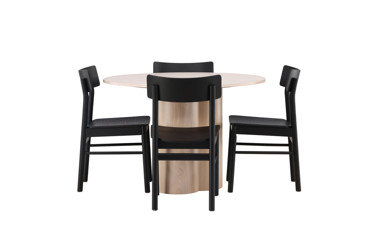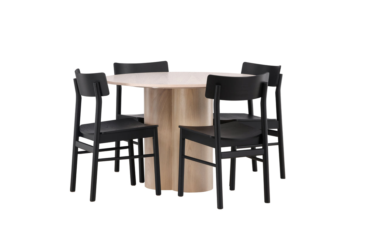Hemmets hjärta ska kännas inbjudande och trivsamt! Vårt vackra matbord Olivia har en genomgående helhetsdesign i vitputsad MDF med en tunn, rund toppskiva och tre cylinderformade ben som sitter samlat under bordets mitt. Här i snygg kombination med 4st svarta matstolar från serien Montros. Stolen är tillverkad i björk och plywood i en askig svart finish. Stolsryggen är lätt rundad och benen har raka nordiska former för en mer traditionell look. Lika modern som tidlös helt enkelt! Bordets diameter: 110cm.