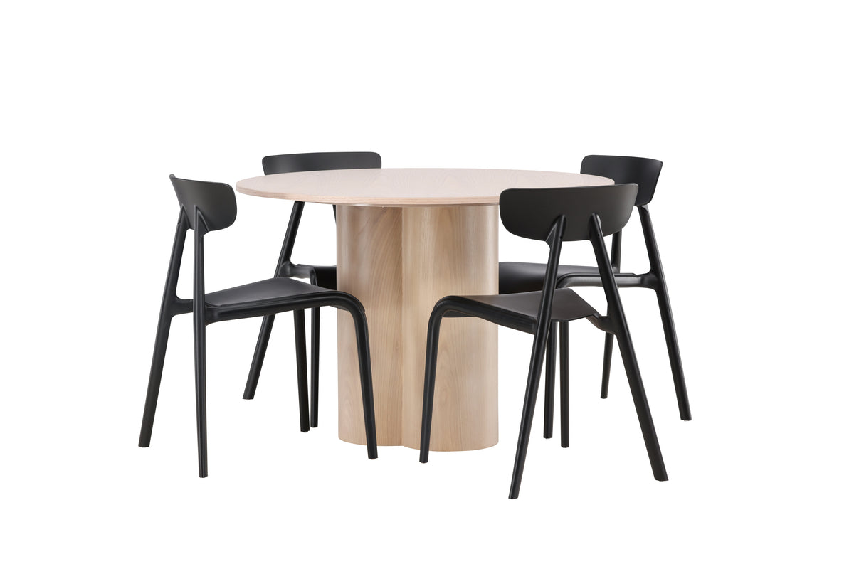 Skapa ett blickfång som imponerar med en modern och lyxig matgrupp! Matbordet från serien Olivia har en genomgående helhetsdesign i vitputsad MDF med en tunn, rund toppskiva och tre cylinderformade ben som sitter samlade under bordets mitt. Här tillsammans med 4st moderna matstolar från serien Ursholmen. Stolen är genomgående tillverkad i slitstark plast och kommer i en läcker svart kulör. Stolsryggen har en nätt storlek och sitsen är något djupare. Skapa en konstnärlig känsla och sätt en personlig prägel på inredningen med den här matgruppen!