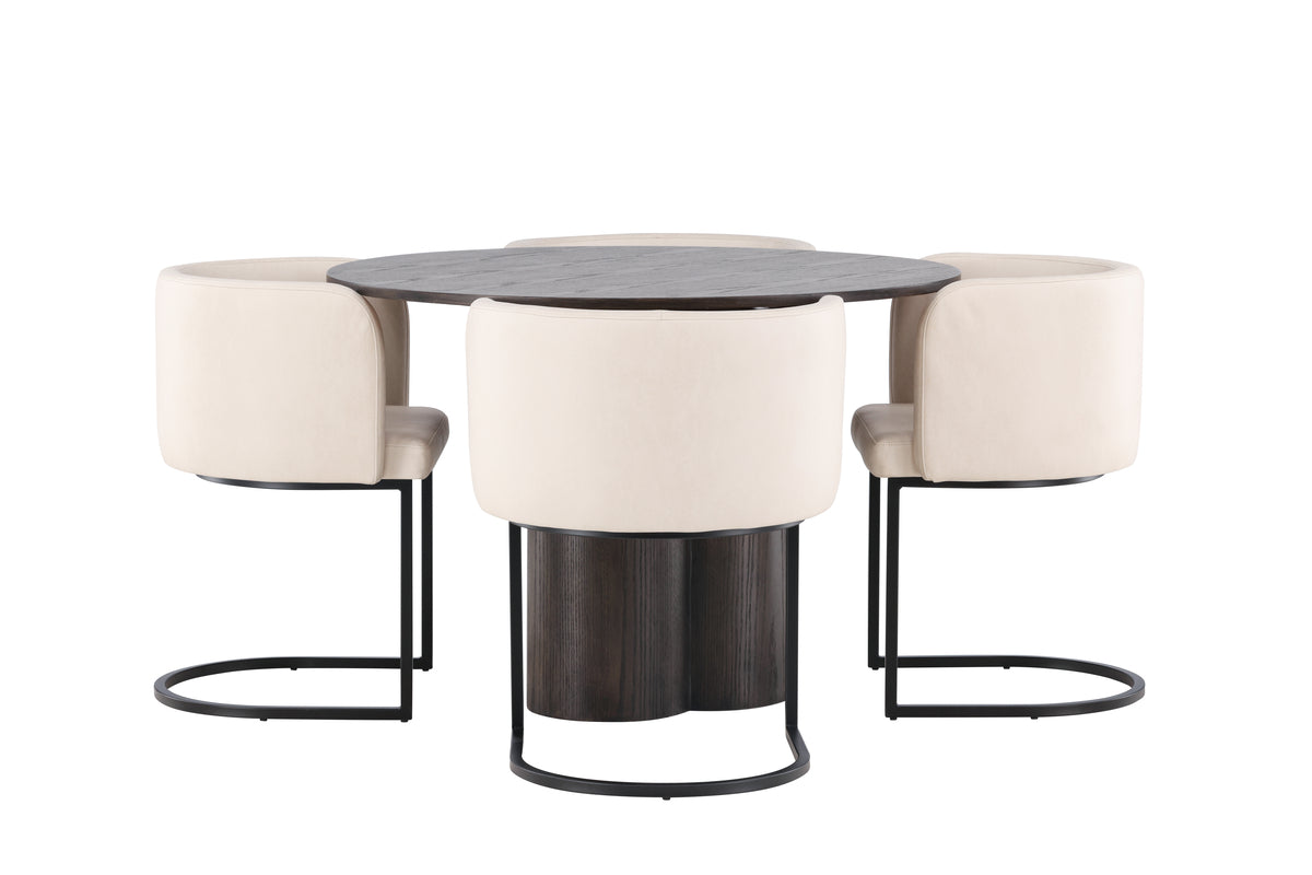 En drömmig matgrupp med charmiga former! Det runda matbordet Olivia har en Skandinavisk helhetsdesign i modern mocca-kulör. Bordet har en tunn bordsskiva i MDF och tre cylinderformade ben som sitter samlade under bordets mitt. Kulören har en lätt täcknad vilket synliggör materialets mönster. Här tillsammans med våra eleganta matstolar från serien Simrishamn. Stolen har en helklädd sits med ett rundat ryggstöd i beige TC-tyg och dekorativ, minimalistisk benstomme i svart stål. Den här kombinationen utstrålar modemedvetenhet! Bordets mått: 110cm.