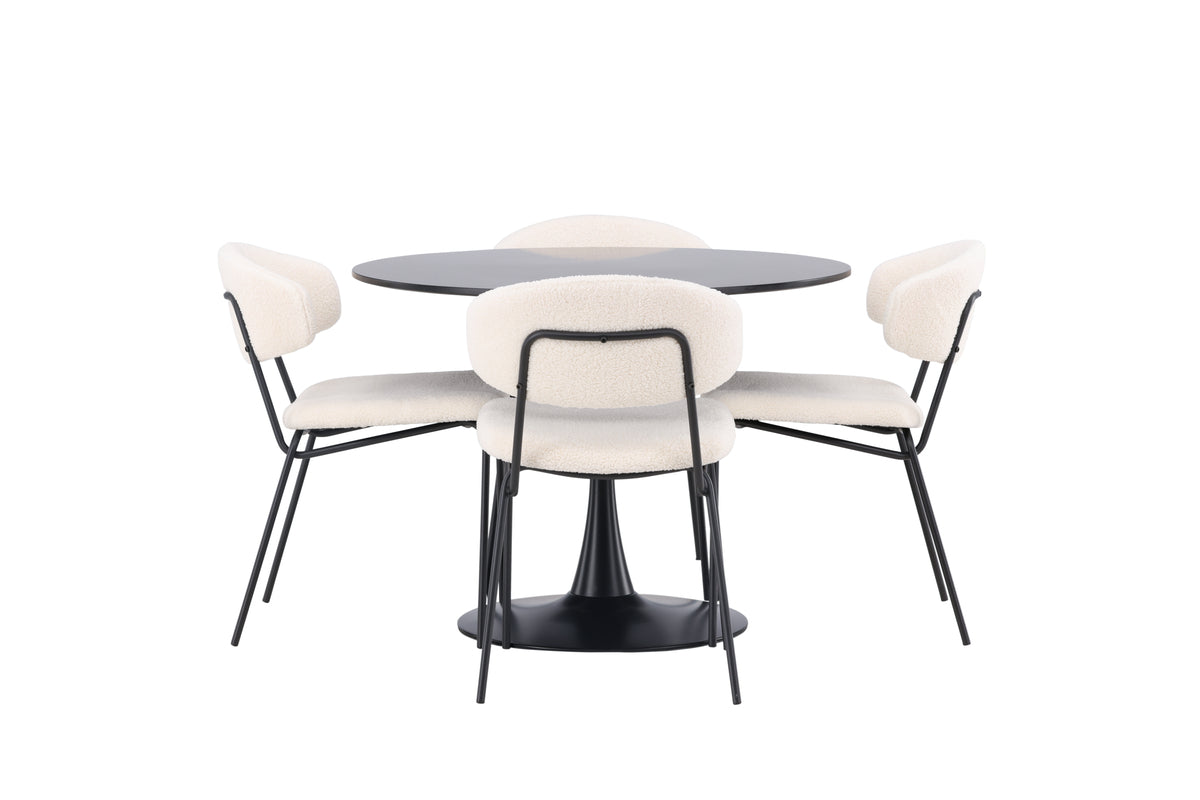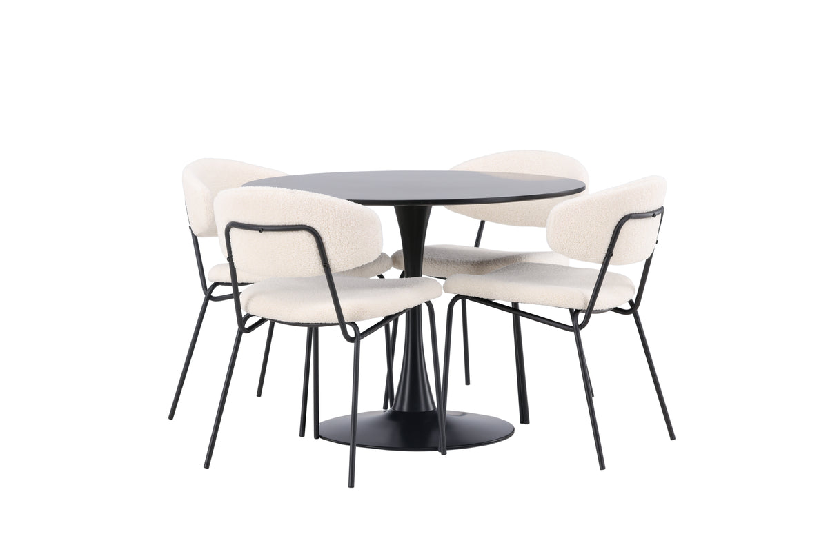 Modernt och minimalistisk design - helt i linje med trenderna! Matbord Glade har en stilren Skandinavisk design med en smäcker trumpetfot i svart stål och en svart bordsskiva i MDF. Här tillsammans med våra underbara, vita matstolar från serien Chico. Stolen är i vitt boucletyg med en stoppad sits och ryggstöd för extra komfort. Benen är smala i svart stål som ger stolen en luftig känsla. Här får du ett charmigt blickfång till vardagsrummet! Bordets mått: 100cm.