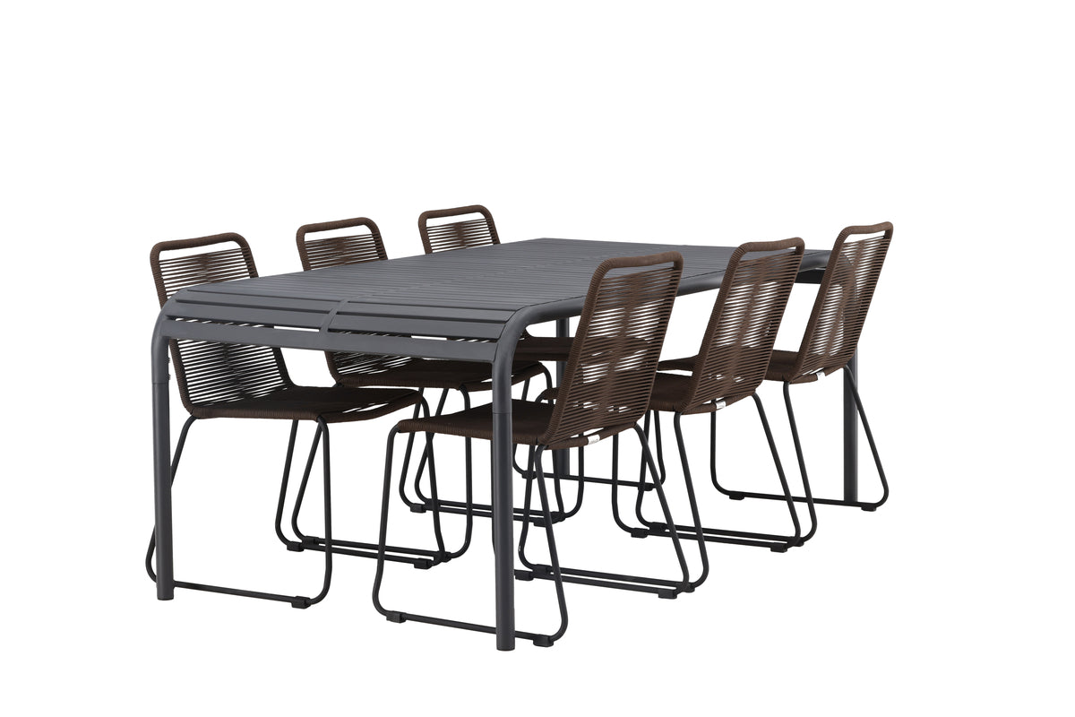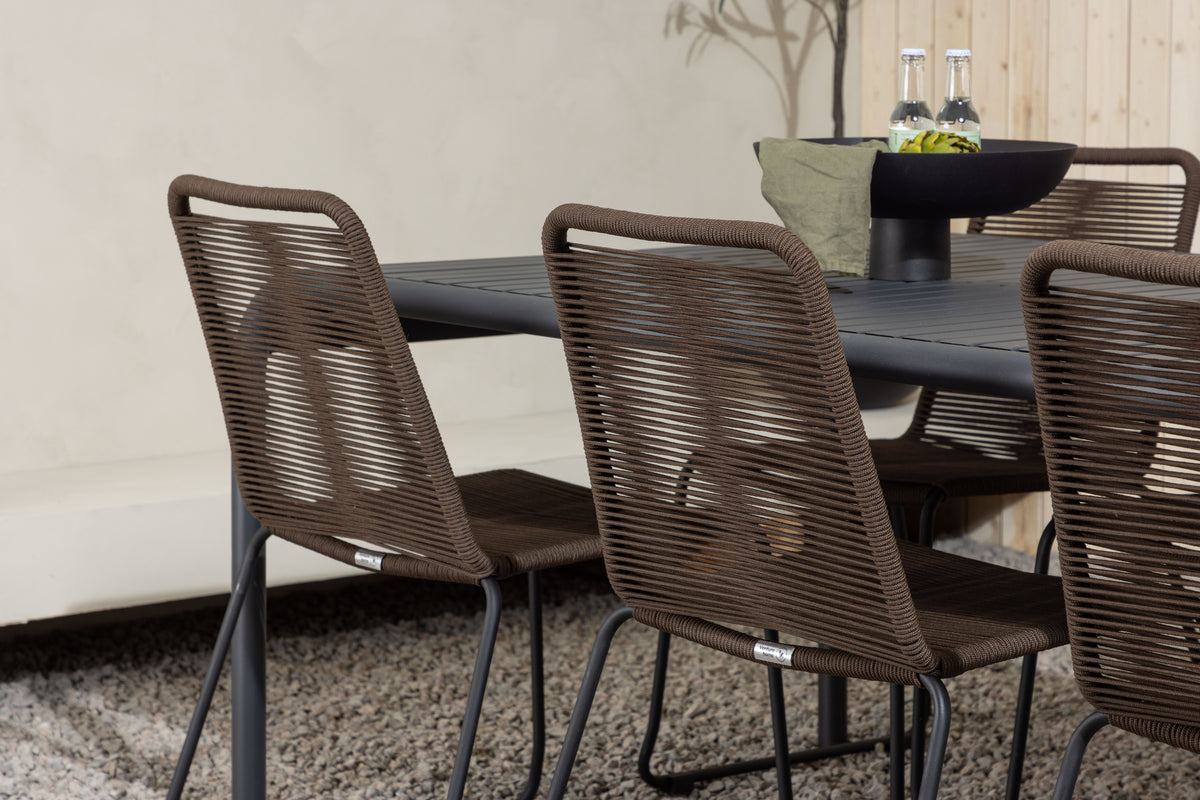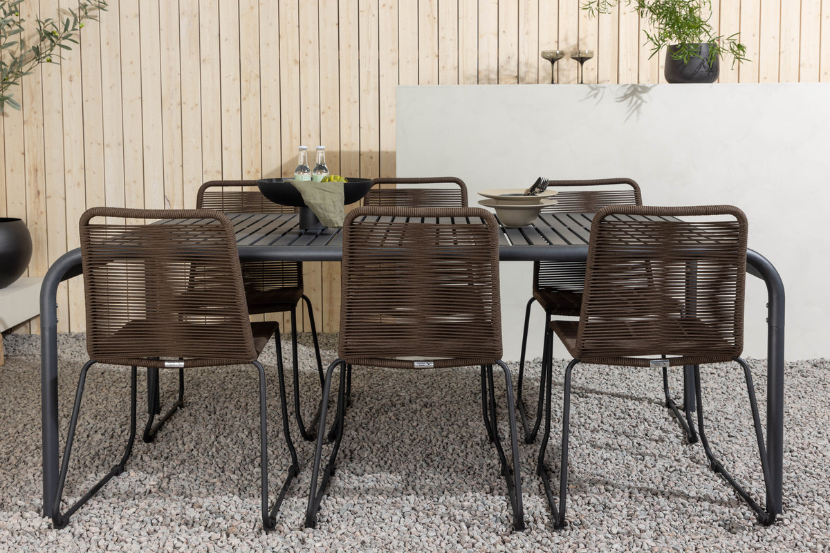 En matgrupp i jordnära färger och modern design! Det rektangulära matbordet Borneo har följsamma former med en ribbad bordsskiva som böljar ner längs kanterna vid benen. Genomgående tillverkat i det slitstarka materialet aluminium. Här i läcker kombination med matstolar från serien Lindos. Stolen har en trendig design med sits i brunt rep och ramkonstruktion i svart stål. Här får du ett modernt blickfång till din uteplats och en trivsam matgrupp till alla måltider! Bordets mått: 200x100x75cm.