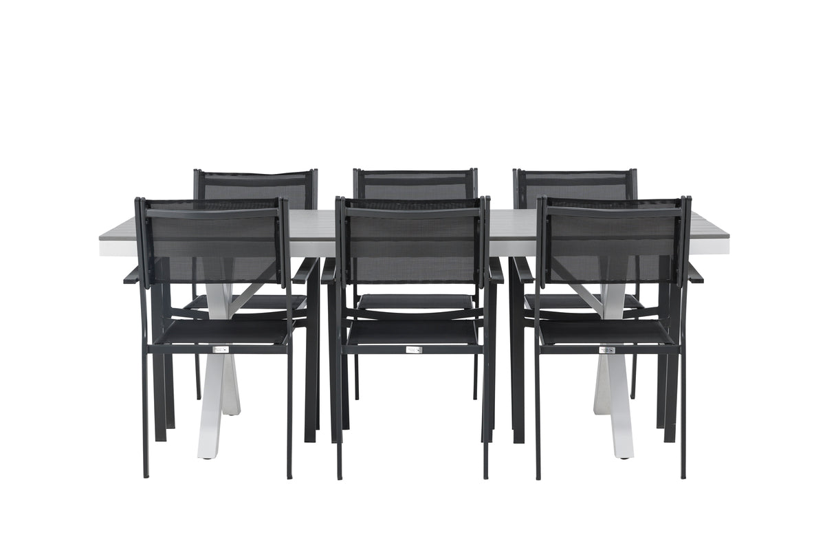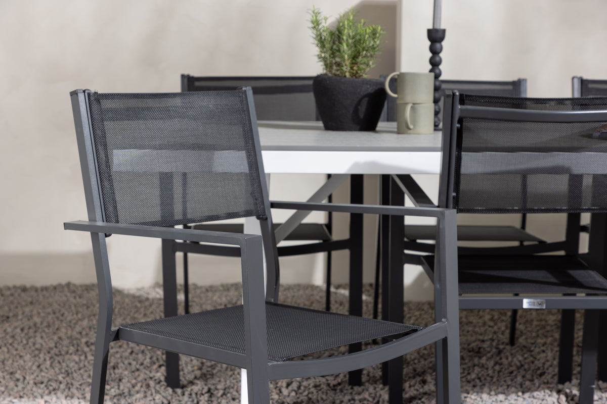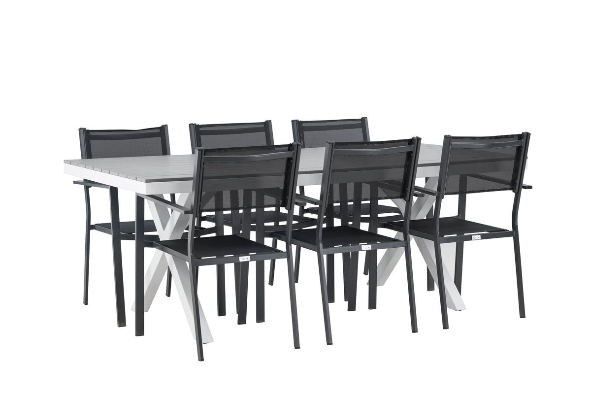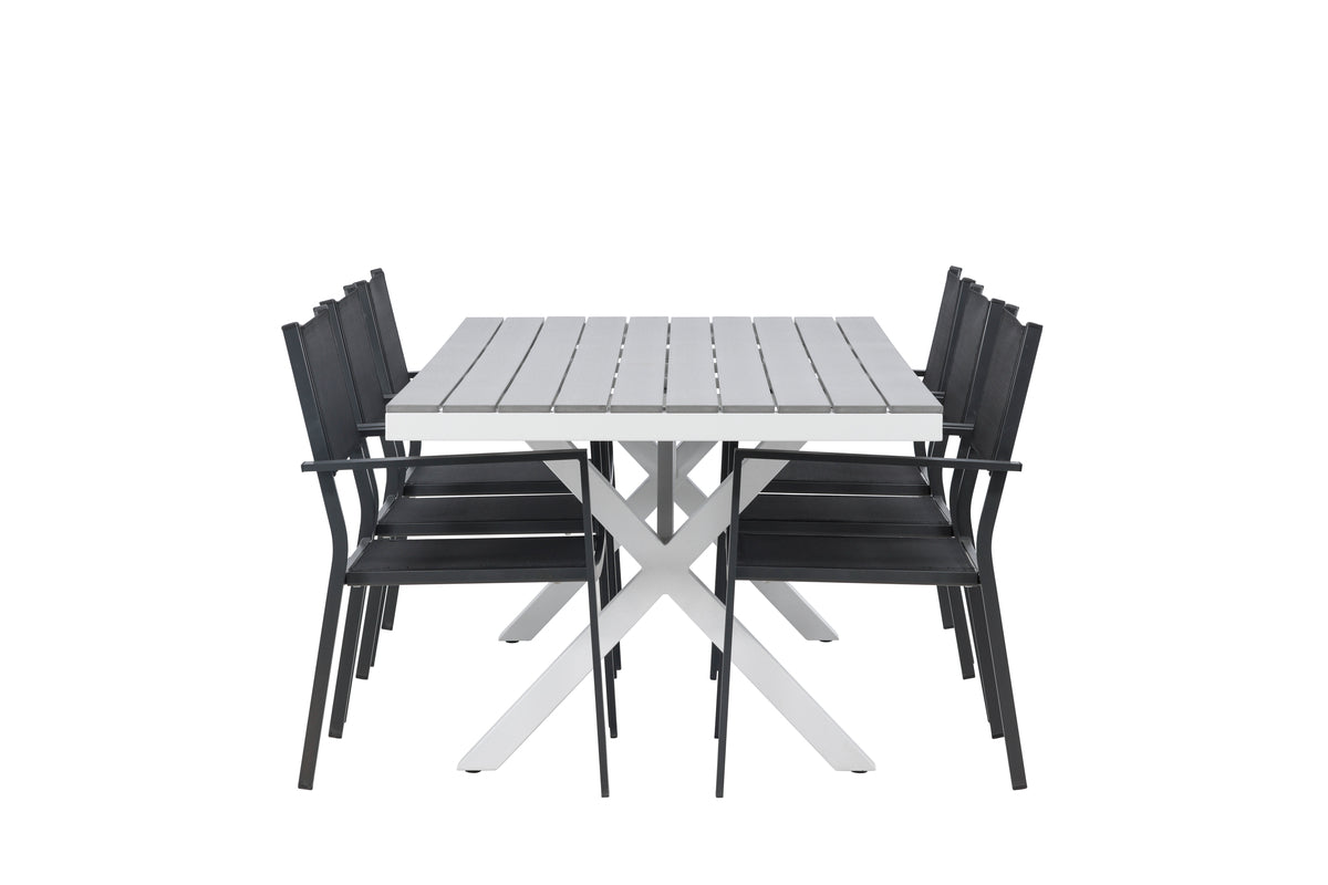 En utomhustålig och modern matgrupp med alla rätt! Vårt rektangulära matbord Garcia har en klassisk design med en bordsskiva i smakfull aintwood och kryssade bordsben i vit aluminium. Här i snygg match med stapelbara matstolar från serien Copacabana. Stolen har en rak nordisk design i svart aluminium och sits i textilene. Bjud hem till sociala måltider på din uteplats i sommar! Bordets mått: 200x100cm.