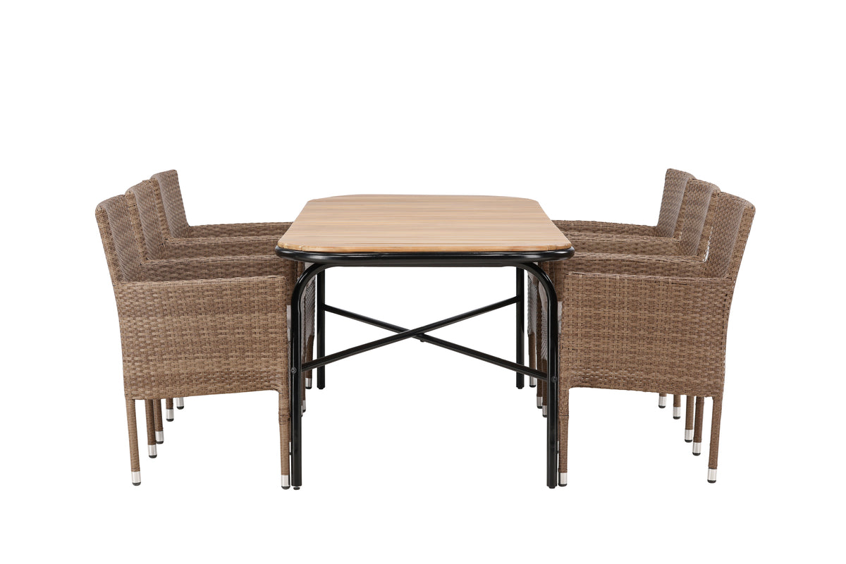 Med den här matgruppen välkomnas du hem till ett varmt och charmigt blickfång! Det populära matbordet Holmbeck har en rektangulär bordskiva i elegant akacia med rundade kanter och ett minimalistiskt underrede i svart stål. Matstolarna tillhör serien Malina och står sig garanterat över tid. Stolen har en stomme i aluminium och är klädd i korgflätad, beige konstrotting. Slipp kompromissa mellan stil och komfort i sommar! Bordets mått: 200x90x75cm.