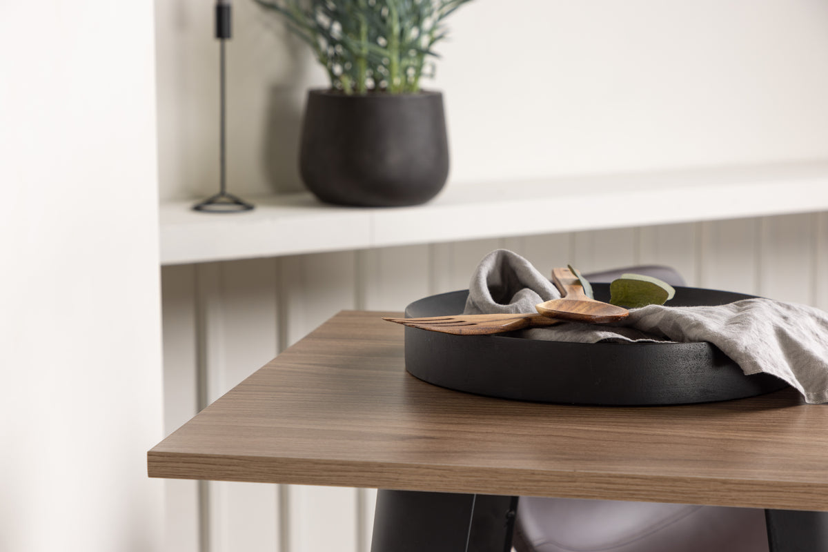 Kombinera minimalism och hållbara material! Barbordet Tempe har en kvadratisk bordsskiva i valnötsfärgad MDF och lätt utsvängda bordsben i svart metall med en ram till fotstöd för extra komfort. Här i snygg kombination med bruna barstolar från serien Alexi. Designen är genomtänkt med en helklädd stol i brunt stoppad polyuretanskinn och polyester och en smal benställning i svart pulverlackerad metall med integrerat fotstöd för extra komfort. Det ska kännas bekvämt på alla nivåer! Bordets mått: 60x60cm.