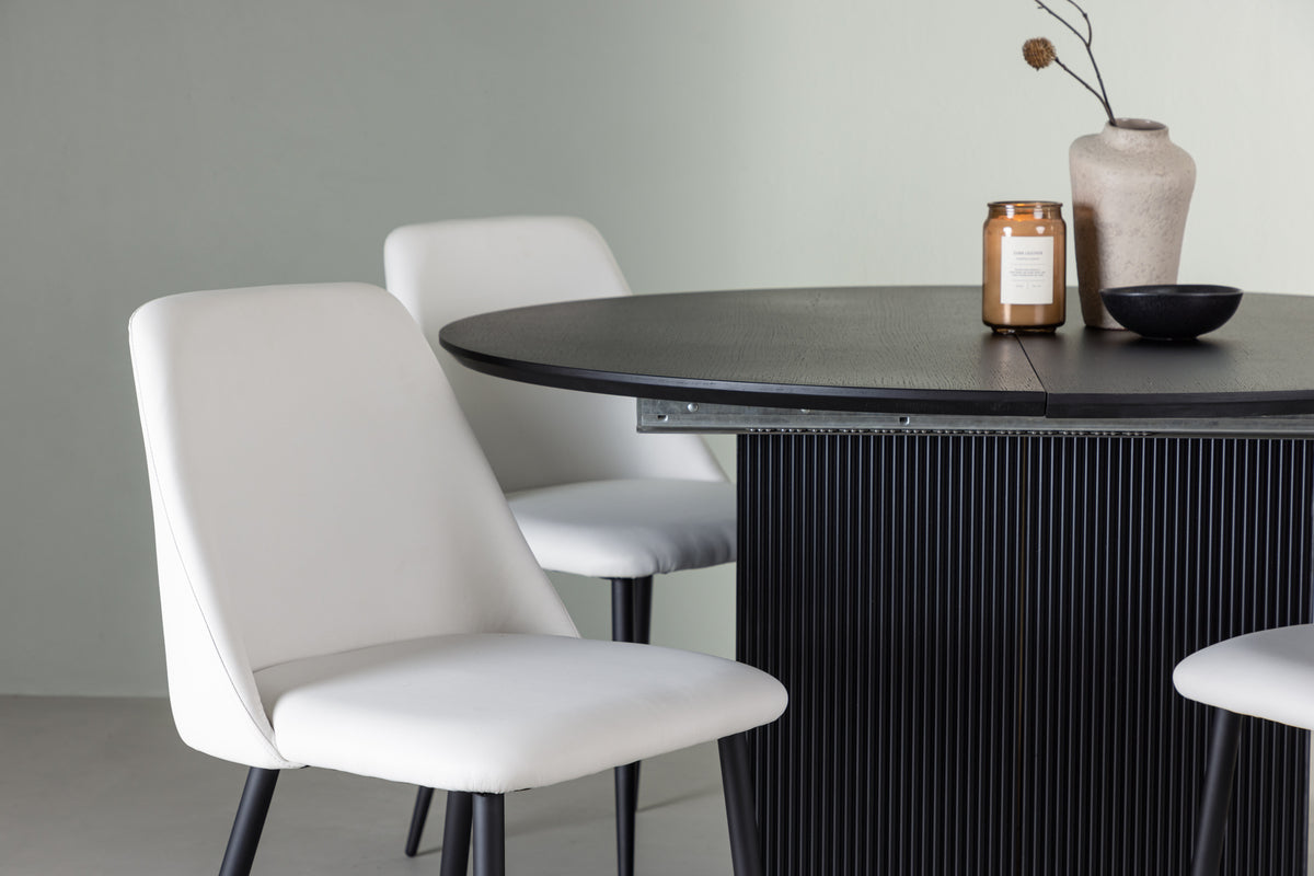 För att komplettera ditt matbord har vi här matchat med vita matstolar från serien Night. Den här stolen drar blickarna till sig och imponerar med sin skandinaviska design. Stolen har en helklädd sits i vit PU-klädsel som ger en känsla av lyx och elegans till din matsal. Stolsbenen är tillverkade av svart stål, vilket ger en stark och stabil konstruktion samtidigt som det ger en modern touch.