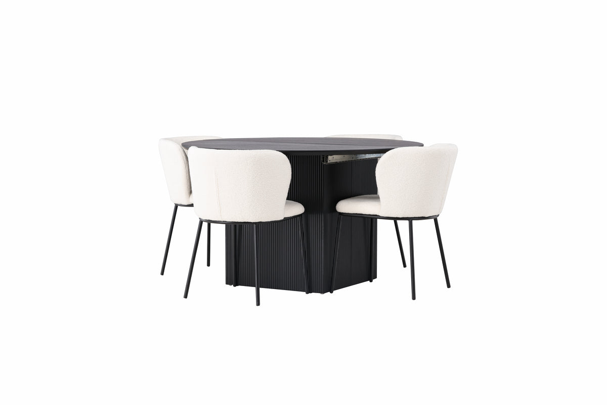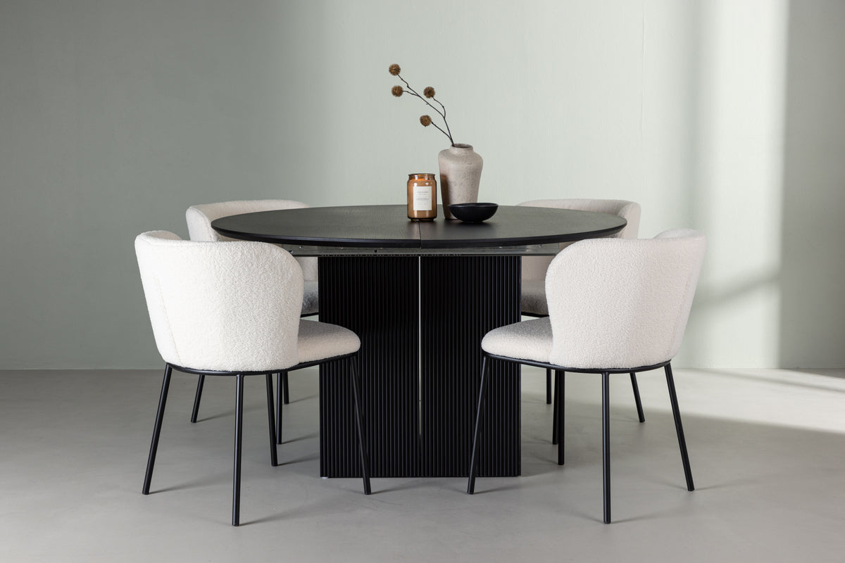 Här har vi matchat matbordet med våra vita matstolar i boucletyg från serien Edina. Edina fångar verkligen de senaste trenderna. Med en följsam och helklädd sits i vitt boucletyg samt minimalistiska stolsben i svart metall, kombinerar denna matstol stilren design med underbar komfort.
