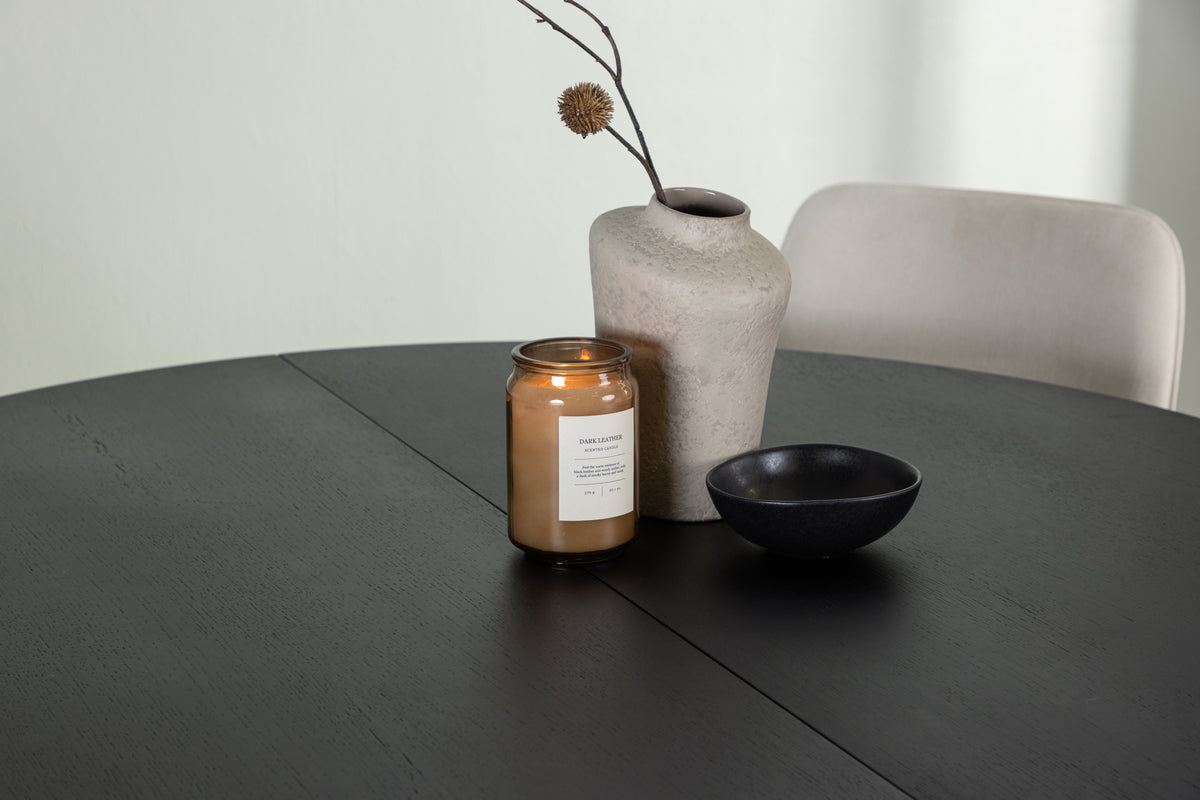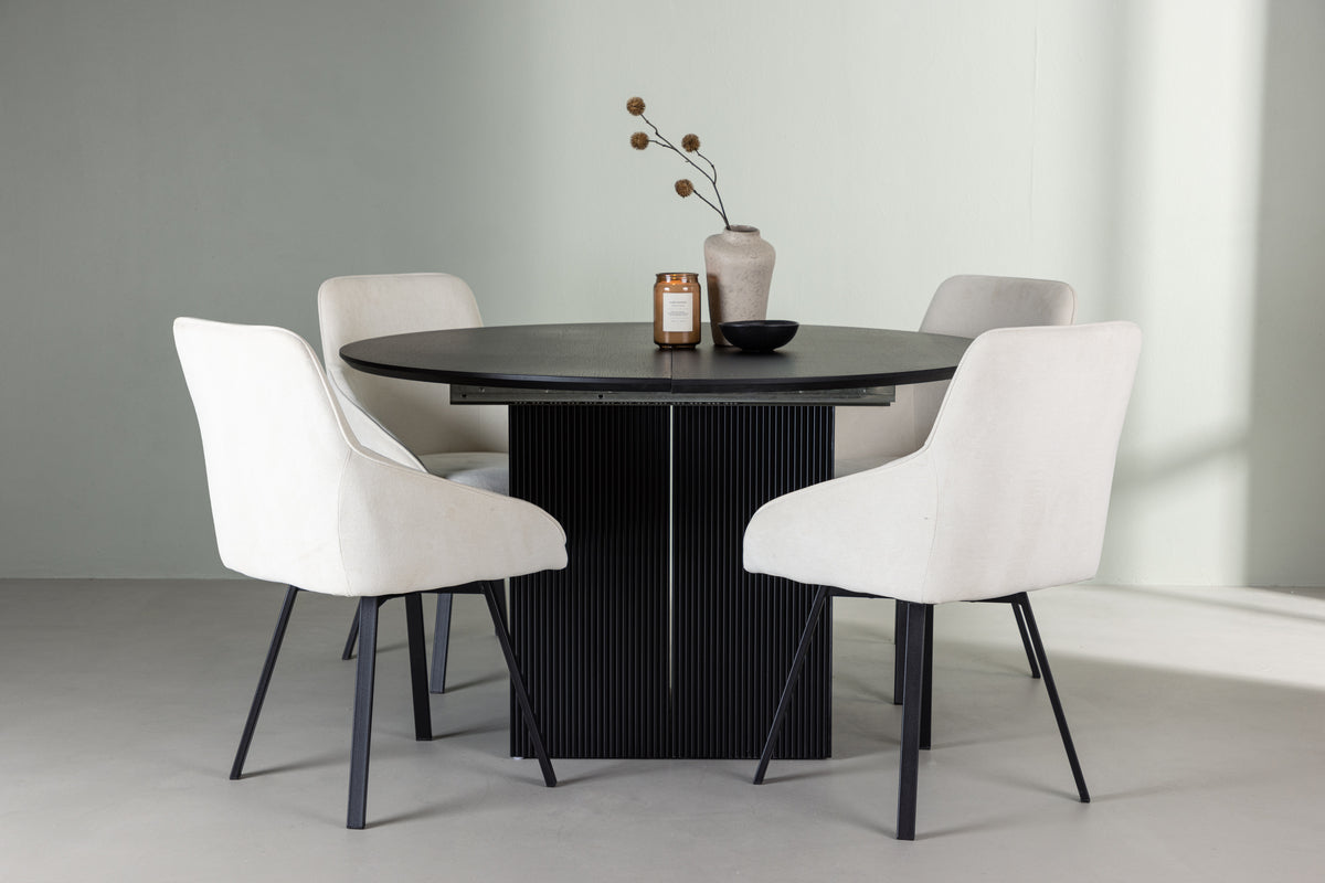 Vårt runda matbord Matilda omvandlas snabbt till ett ovalt bord med hjälp av sin förlängningsbara funktion. Med en rund toppskiva i svart MDF med faner och robusta, klossformade ben ger Matilda dessutom också en modern och elegant touch till ditt hem. Bordets mått i diameter: 130cm.