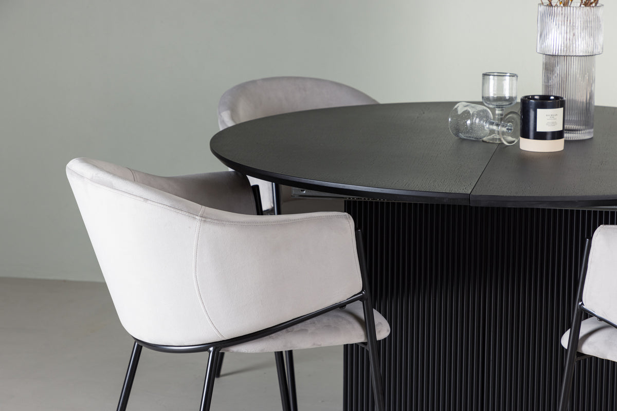 Tillsammans med vårt svarta matbord Matilda har vi matchat våra grå matstolar Evelina som kompletterar varandra på bästa sätt. Dessa stolar har en modern och bekväm design som omedelbart fångar din uppmärksamhet. Den helklädda sitsen i ljusgrå sammet ger en touch av lyx och elegans, medan det rundade ryggstödet erbjuder både stöd och komfort under långa middagar.