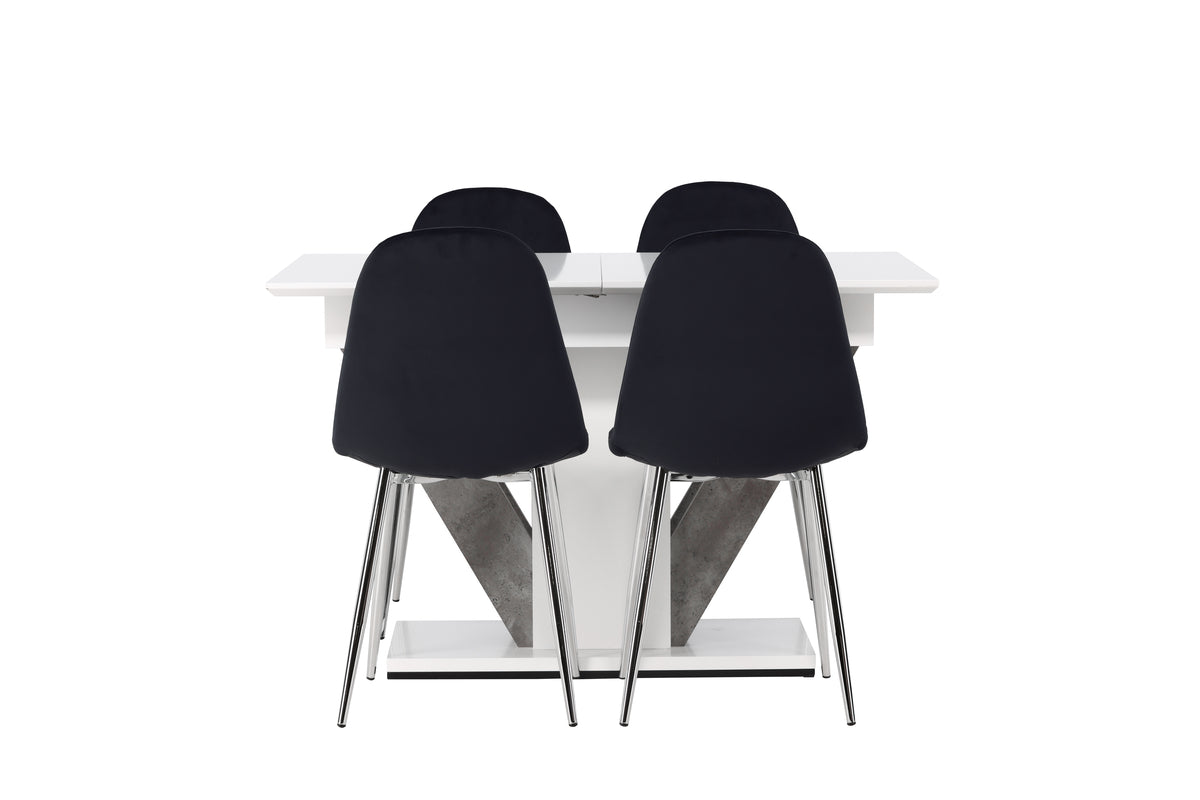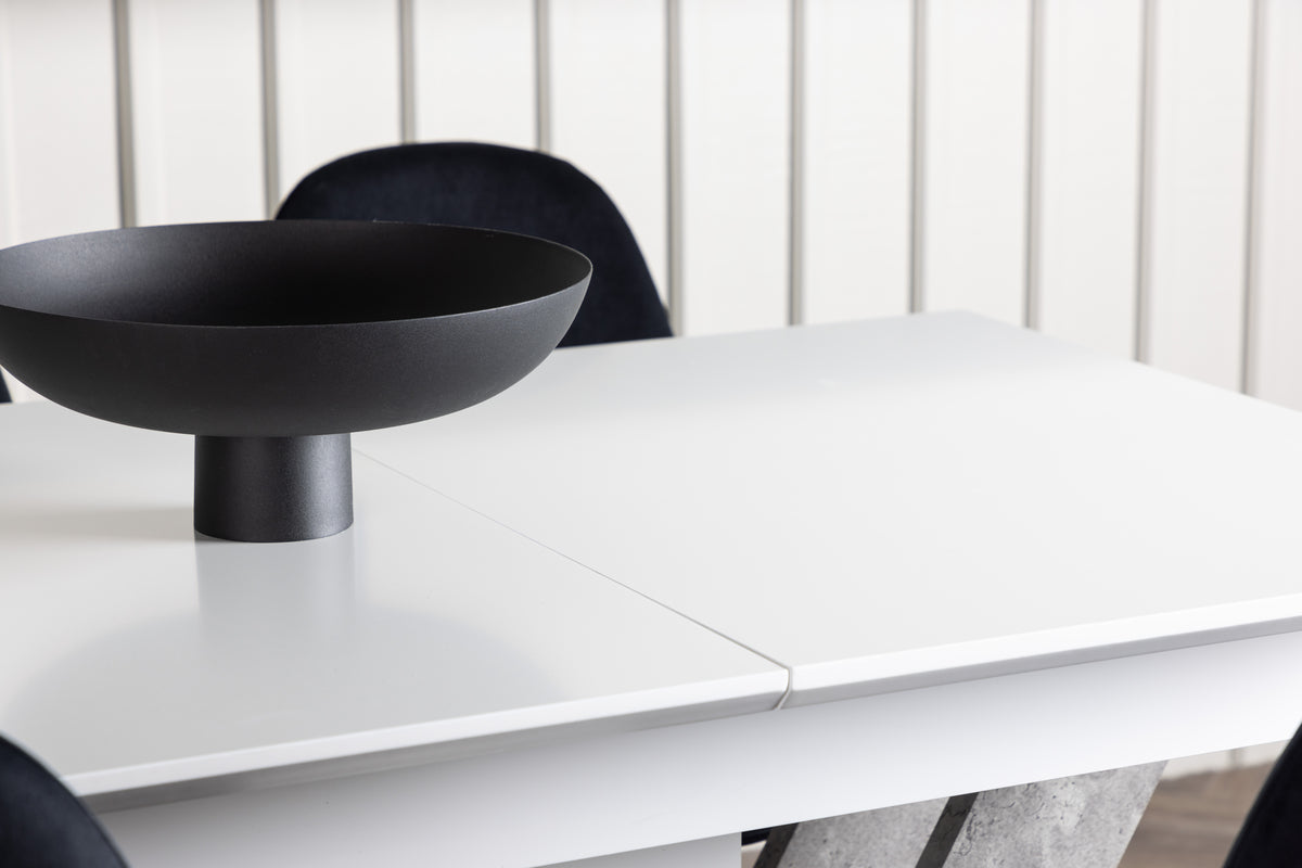 Möblera hemmets hjärta inbjudande och skapa en mysig atmosfär som lockar både stora och små, nära och kära till trivsamma måltider framöver! Vårt rektangulära matbord Disa har en vit bordsskiva i MDF och ett center-placerat underrede i samma material. Bordet har också två stommar i grå MDF som blir en snygg detalj. Men det bästa av allt är att matbord Disa är förlängningsbart. Oavsett om du har en mysig middag med familjen eller underhåller gäster, kan du enkelt anpassa bordet efter dina behov. Bordets mått: 120/160x80cm. Tillsammans med våra sammetsstolar från Polar-serien blir den här matgruppen komplett. Polar-stolarna imponerar med sin helklädda design, eleganta ben i kromad metall och en lätt rundad rygg för extra komfort. Sitsen är klädd i ett smäckert svart sammetstyg som både känns lyxigt och behagligt att sitta på. Det ska känna skönt att komma hem till mysiga måltider!