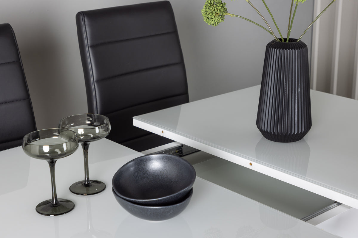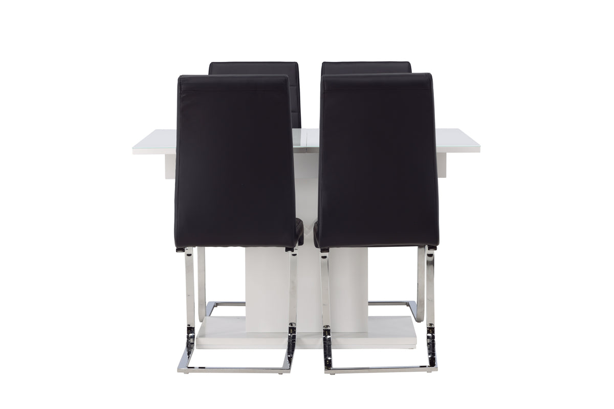 Och vad vore ett elegant matbord utan matchande stolar? Därför inkluderar vi de fantastiska matstolarna Tempo. Stolarnas nordiska design och dekorativa stomme kommer att ge din matupplevelse en extra touch av stil. Den svarta PU-klädseln tillsammans med de kromade benen skapar en harmonisk kontrast som omedelbart fångar uppmärksamheten.
