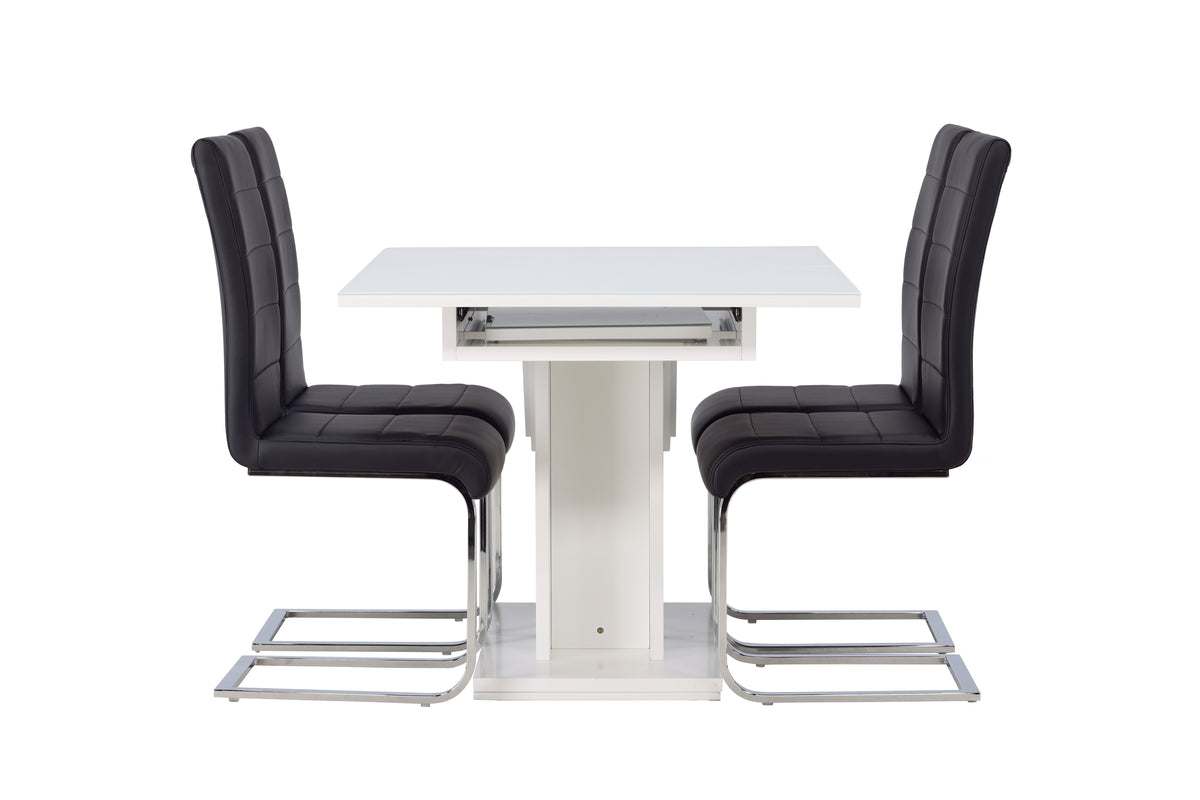 Detta förlängningsbara matbord från serien Pluto har en trendig design och hållbar kvalitet. Bordsskivan är i vit MDF med en glasskiva ovanpå som blir en snygg detalj. Bordets förlängningsbara funktion gör det enkelt att rymma både små och stora sällskap, vilket gör detta bord till en perfekt investering för alla slags tillfällen. Bordets mått: 120/160x90cm.