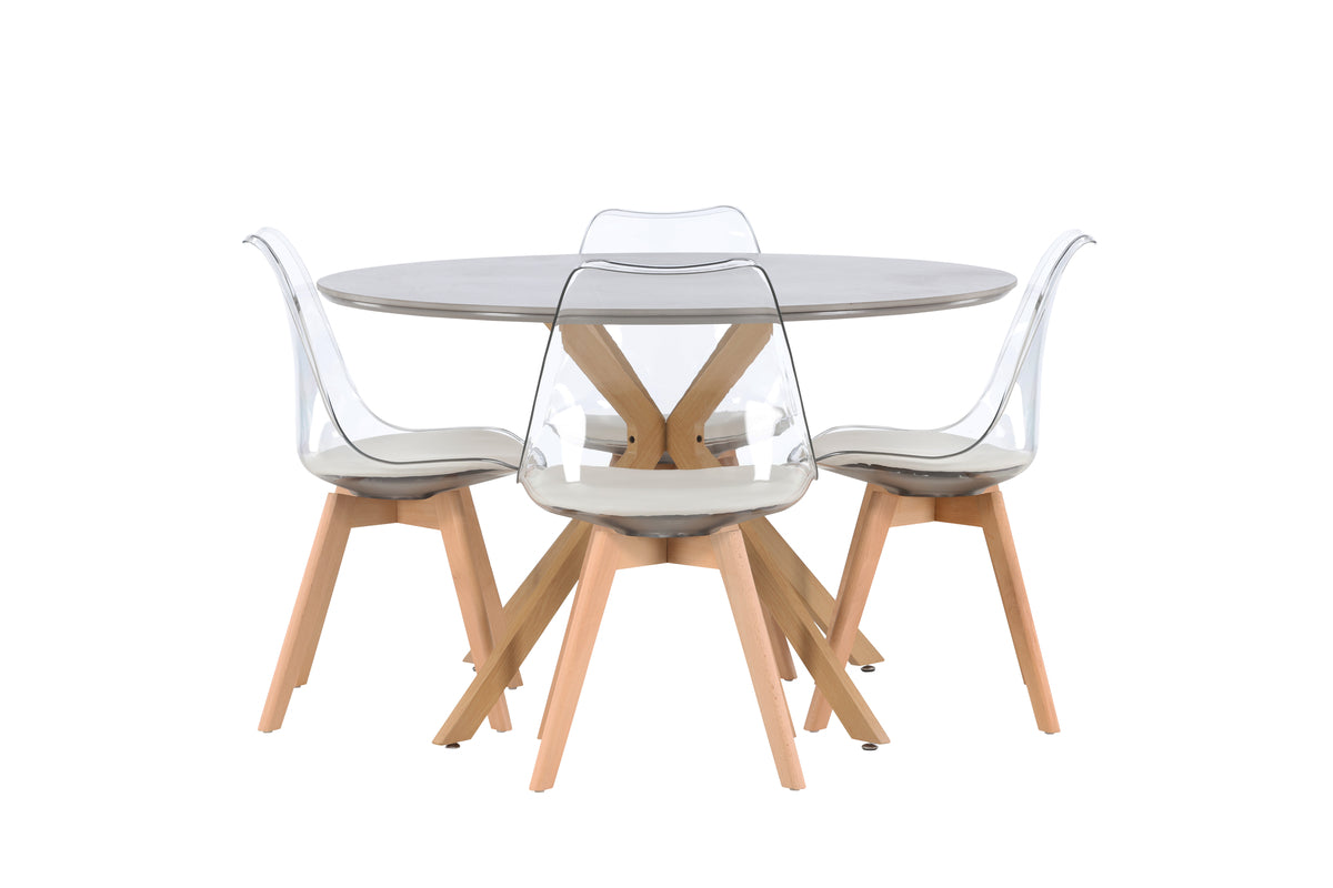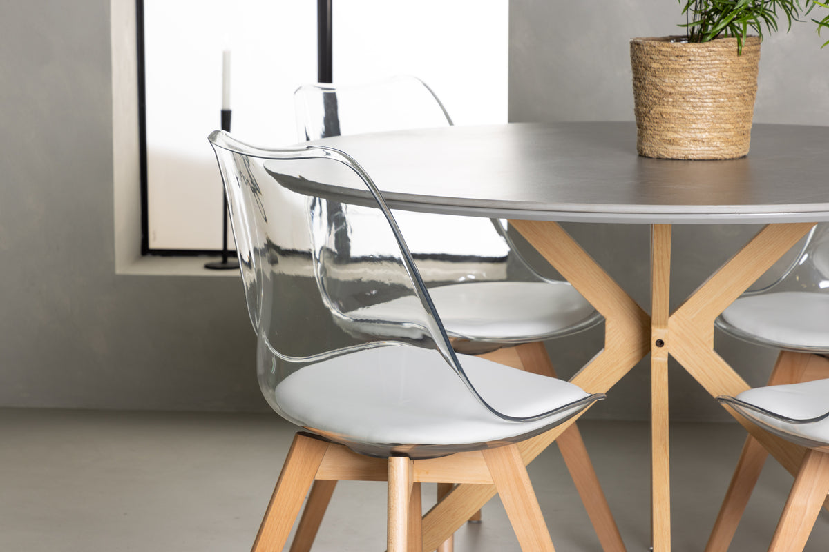 En modemedveten matgrupp i modern stil är kanske precis vad ditt hem behöver för att lyfta inredningen till nästa nivå! Vårt runda matbord Piazza är det ultimata valet för den stilmedvetna som söker ett unikt matbord till det större köket eller vardagsrummet. Bordet har en rund bordsskiva tillverkad i vacker grå spraystone och en stomme med kryssben i trä som blir en dekorativ look. Bordets mått: 120cm. Här i perfekt kombination med våra designrika matstolar från serien Edvin. Den här stolen har en transparant sits i PET, som genomsyrar modemedvetenhet och ger en luftig känsla till din inredning. För att maximera komforten har vi inkluderat en vit sittdyna, vilket gör att du kan sitta bekvämt under långa middagar. Stolsbenen är lätt utsvängda i naturträ och bidrar till den harmoniska helheten. Med den här matgruppen får du en underbar kombination av stil, kvalitet och komfort. Ge ditt matrum den perfekta balansen mellan lyx och trend!