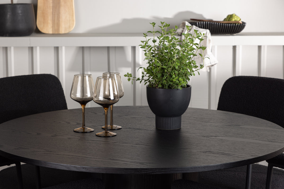 Vårt runda matbord Olivia blir snabbt favoriten i hemmet. Det här svarta MDF-bordet har en rund toppskiva som ger en modern touch. Med sina tre snyggt placerade, cylinderformade ben får bordet en stilren unikhet och stabilitet. Den eleganta svarta kulören är dessutom enkel att matcha med olika inredningsstilar. Bordets mått: 110cm.