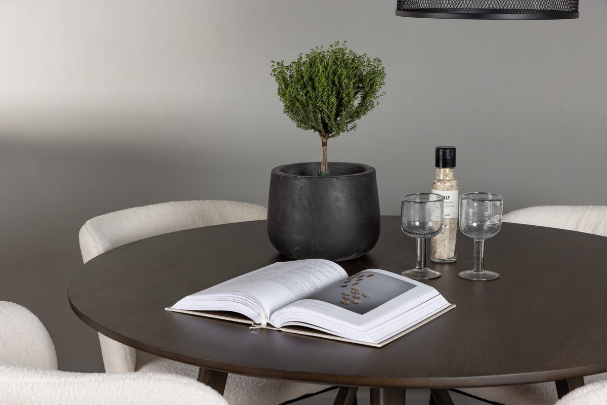 Vårt runda matbord Kaseidon har en tunn bordsskiva tillverkad av hållbart MDF-material och försiktigt utsvängda bordsben i gummiträ, vilket ger en härlig kombination av elegans med hållbarhet.