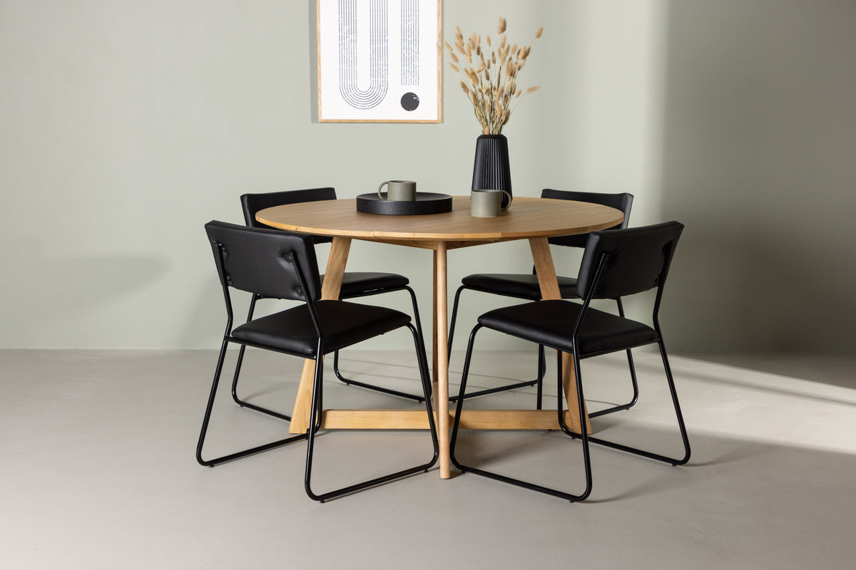 Här i fantastisk kombination med svarta matstolar från serien Kenth. Stolens minimalistiska och moderna design ger en luftig känsla till rummet samtidigt som de erbjuder optimal komfort. Med sin svarta polyuretanskinn- och polyesterklädsel ger Kenth matstolarna en känsla av lyx och elegans. Du kan luta dig tillbaka och koppla av medan du njuter av en härlig måltid. De dekorativa och smala järnbenen ger inte bara stabilitet, utan också en modern touch till din inredning.