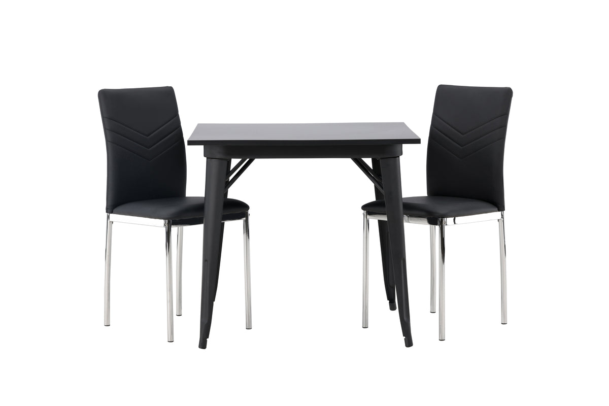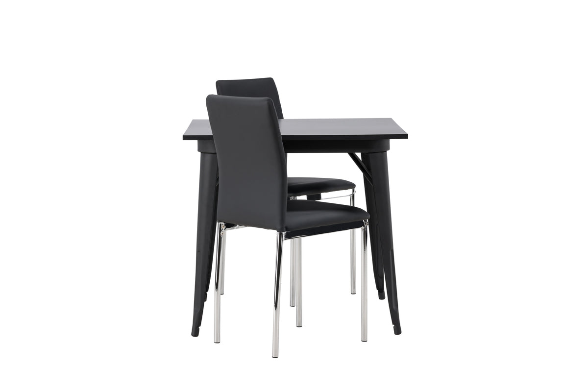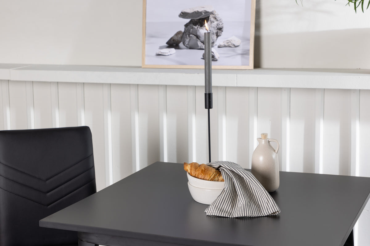 En tålig och smart matgrupp med personlig känsla! Vår kvadratiska matbord Tempe har en nätt storlek och trendig, Skandinavisk utformning. Tillverkad med en bordsskiva i svart MDF och bordsben i svart metall. Här tillsammans med dekorativa, svarta matstolar från serien Lily. Stolen är helklädd i svart konstläder och ryggen har dekorsömmar som blir till en snygg detalj. Stolsbenen är i kromat stål och ger en snygg industriell look till blickfånget. Vad mer kan man önska? Bordets mått: 80x80cm.