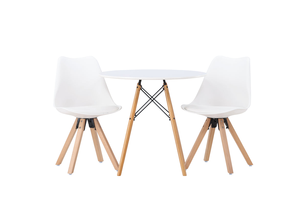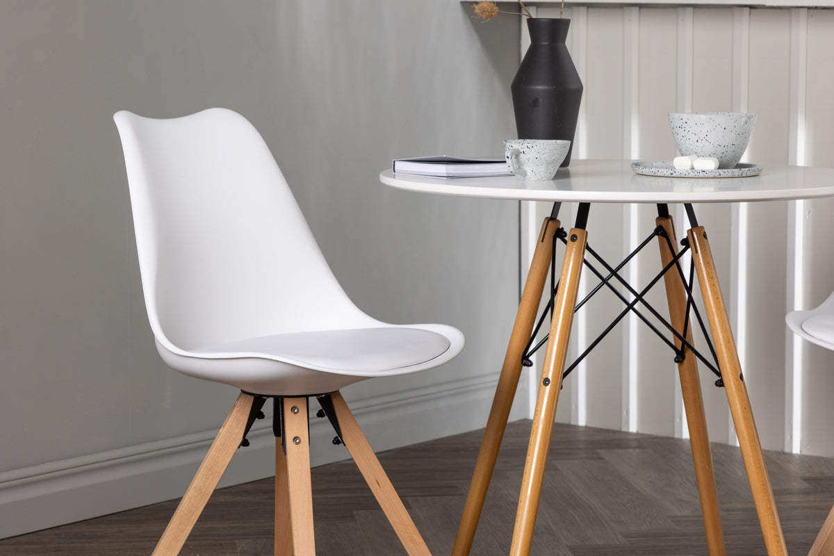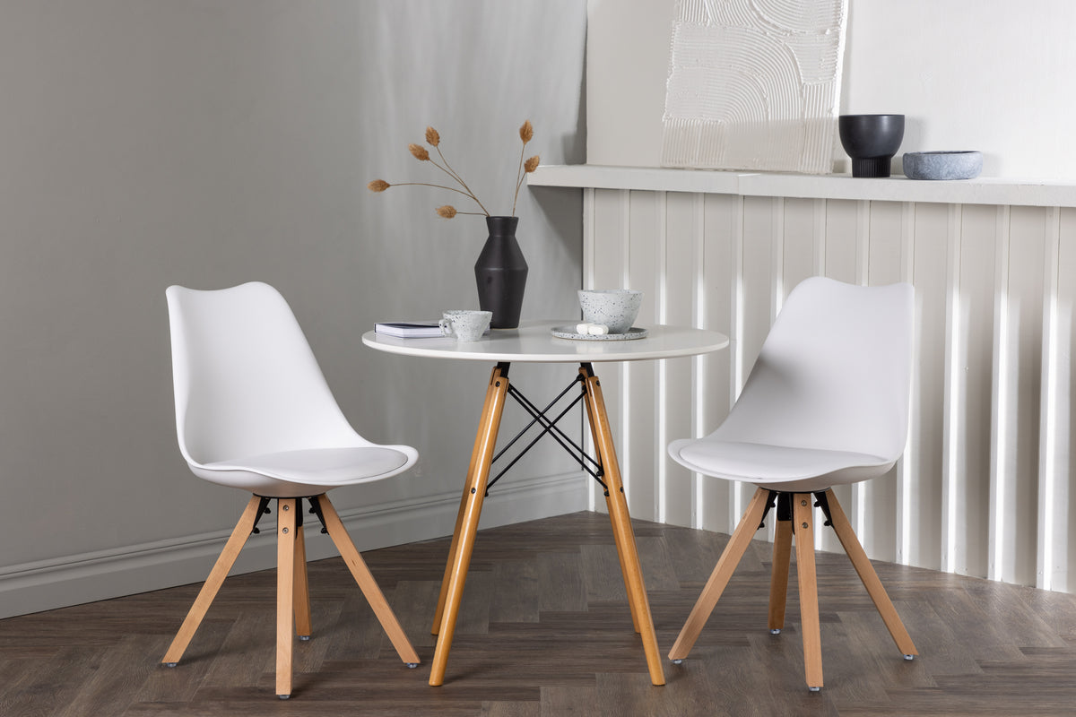 En fantastisk matgrupp i liten storlek! Det runda matbordet Danburi har en klassisk design med en rund bordsskiva i vit MDF och lätt utsvängda ben i bokträ med dekorativa detaljer i svart stål. Här tillsammans med våra fantastiska, vita matstolar från serien Zeno. Stolen har en inbjudande utformning med rygg och sits i vit plast, inbyggd sittdyna med hög komfort och fyra utsvängda ben i trä. Det blir inte bättre än såhär! Bordets diameter: 60cm.