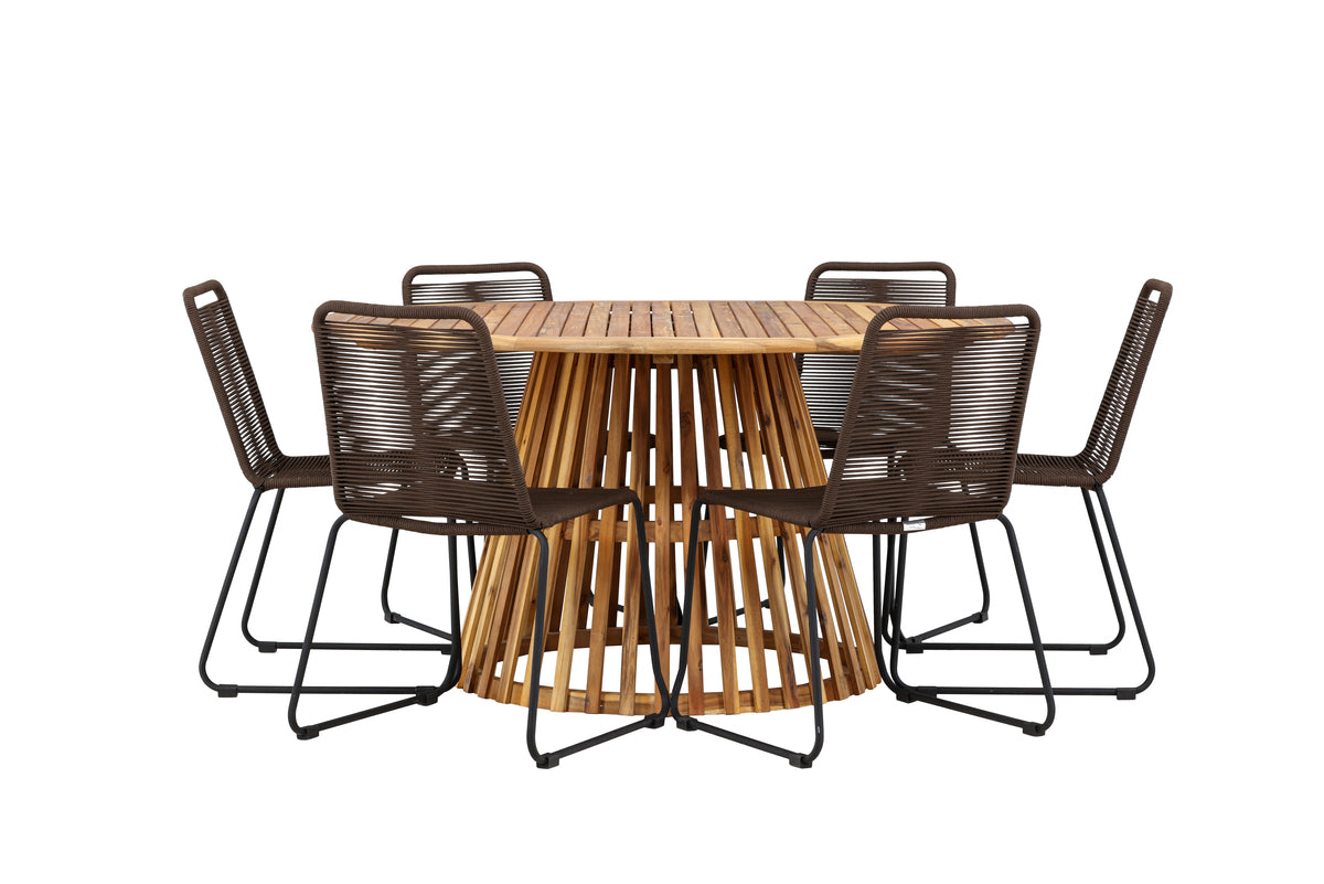 Upptäck den perfekta matgruppen för din utomhusmiljö med vår eleganta Tucumán-bord och de stilfulla Lindos-stolarna. Med en imponerande diameter på 120 cm erbjuder Tucumán-bordet gott om plats för familjemiddagar och trevliga tillställningar under öppen himmel. Tillverkat av akaciaträ ger Tucumán-bordet en naturlig och inbjudande känsla till din utomhusmiljö. Dess naturfärg smälter harmoniskt in i omgivningen och skapar en fridfull atmosfär där du och dina gäster kan koppla av och njuta av goda måltider. Stolarna Lindos är tillverkade av aluminium, vilket ger dem en bra konstruktion för utomhusbruk. Den eleganta svarta färgen på stolarna ger en sofistikerad touch till din utomhusmatplats och kompletterar bordets naturliga träfärg på ett stilfullt sätt. Denna matgrupp levereras komplett med sex bekväma stolar, perfekta för avkopplande måltider och sociala samkväm utomhus. Med Tucumán och Lindos-matgruppen kan du skapa en inbjudande och stilfull utomhusmiljö där din familj och dina gäster kan njuta till fullo.