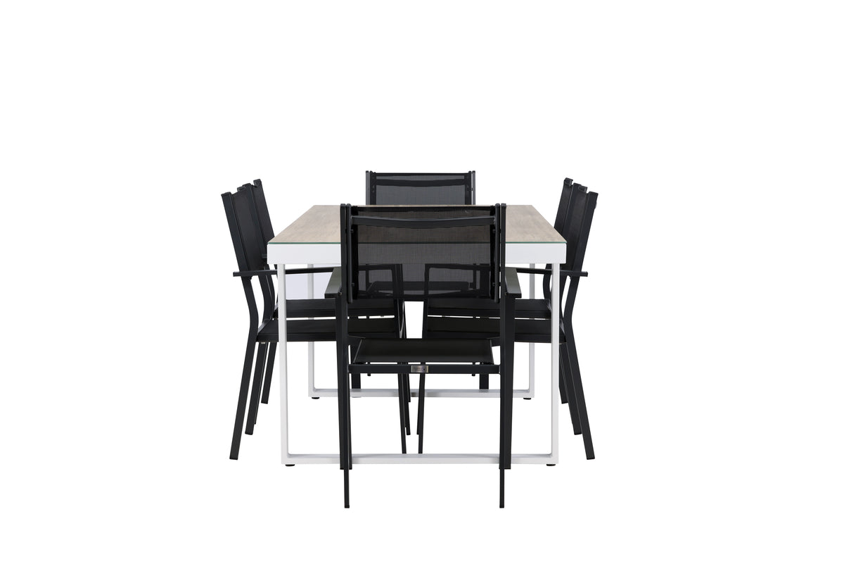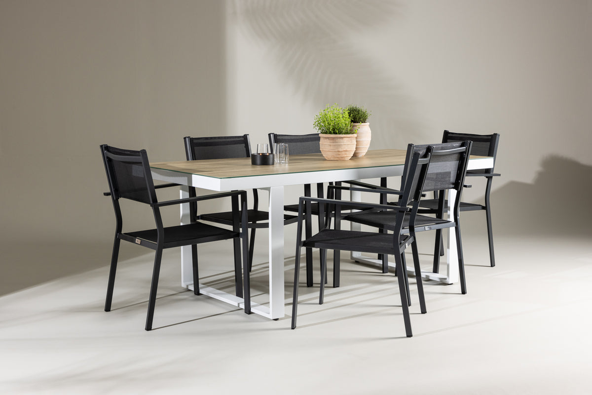 Upptäck den perfekta matgruppen för din utomhusmiljö med vår eleganta Merlo-bord och de stilfulla Copacabana-stolarna. Med sitt moderna utseende och praktiska design blir denna ensemble ett utmärkt tillskott till din uteplats eller trädgård.