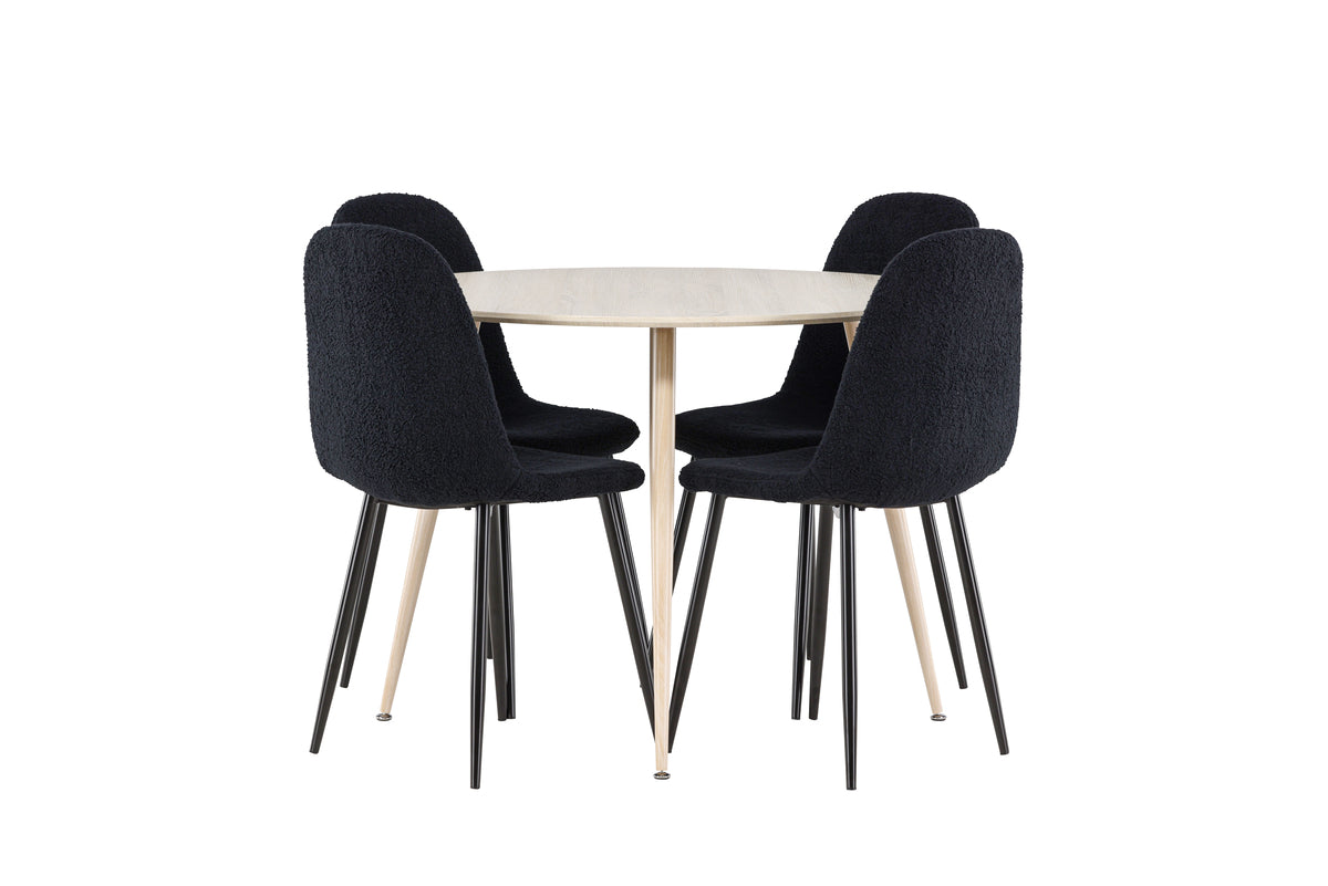 Upptäck Polar matstolen och Plaza matbordet - den perfekta kombinationen av modern elegans och enkelhet för ditt matsalsarrangemang. Stolen är FSC®-certifierad (FSC®C177288) vilket innebär att den består av trä som kommer från ett ansvarsfullt skogsbruk, ett skogsbruk som tar hänsyn till människor och miljö. Polar är det ultimata valet för att ge din matsal en stilfull och samtida touch. Stolens djupa svarta färg och material av polyester teddy ger en exklusiv känsla och erbjuder en bekväm sittupplevelse för alla dina middagar och sammankomster. Dess moderna design och rena linjer ger en tidlös estetik som kompletterar alla inredningsstilar. Polar matstolens ben är tillverkade av svart stål, vilket ger en stadig och robust konstruktion samtidigt som det bidrar till dess eleganta utseende. Med dess enkelhet och mångsidighet kommer Polar att vara ett välkommet tillskott till ditt hem. Plaza matbordet tar din middagsupplevelse till nästa nivå med sin stil och funktionalitet. Med en generös diameter på 100 cm och tillverkat av MDF-material, är Plaza en smakfull och hållbar möbel för dina måltidsstunder. Dess vitpigmenterade färg ger en varm och inbjudande känsla till rummet, medan den moderna designen och de rena linjerna skapar en känsla av lugn och harmoni. Det kompakta formatet gör Plaza perfekt för mindre utrymmen och ger ändå tillräckligt med plats för att bekvämt kunna njuta av måltider med familj och vänner. Ge din matsal en uppgradering med Polar matstolen och Plaza matbordet - en kombination av bekvämlighet, modern design och stil som är perfekt för daglig användning och speciella tillfällen.