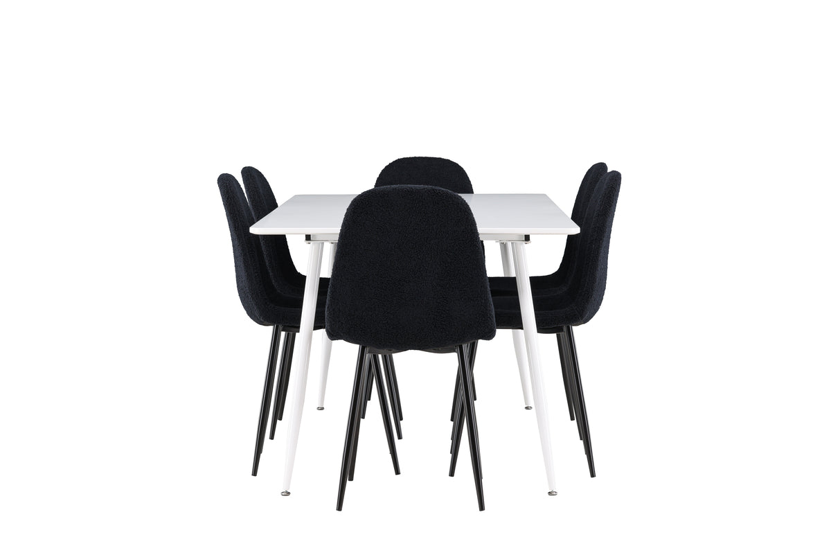 Upptäck Polar matstolen och Silar matbordet - den perfekta kombinationen av modern elegans och mångsidighet för ditt matsalsarrangemang. Stolen är FSC®-certifierad (FSC®C177288) vilket innebär att den består av trä som kommer från ett ansvarsfullt skogsbruk, ett skogsbruk som tar hänsyn till människor och miljö. Polar matstolen är det ultimata valet för att ge din matsal en stilfull och samtida touch. Stolens djupa svarta färg och material av polyester teddy ger en exklusiv känsla och erbjuder en bekväm sittupplevelse för alla dina middagar och sammankomster. Dess moderna design och rena linjer ger en tidlös estetik som kompletterar alla inredningsstilar. Polar matstolens ben är tillverkade av svart stål, vilket ger en stadig och robust konstruktion samtidigt som det bidrar till dess eleganta utseende. Med dess enkelhet och mångsidighet kommer Polar att vara ett välkommet tillskott till ditt hem. Silar matbordet erbjuder generösa mått på 180x90 cm, vilket ger tillräckligt med plats för att välkomna dina nära och kära. Det vita bordet ger en ljus och luftig känsla till rummet och skapar en inbjudande atmosfär för måltider och samvaro. Silar är inte bara praktiskt, det är också trendigt och passar perfekt in i moderna inredningar. Skapa minnen och dela goda stunder med vänner och familj vid Silar matbordet, oavsett om det är för vardagliga måltider eller festliga tillfällen. Tillsammans utgör Polar matstolen och Silar matbordet en elegant och funktionell matgrupp som kommer att bli en central punkt i ditt hem, där gemenskap och glädje frodas.