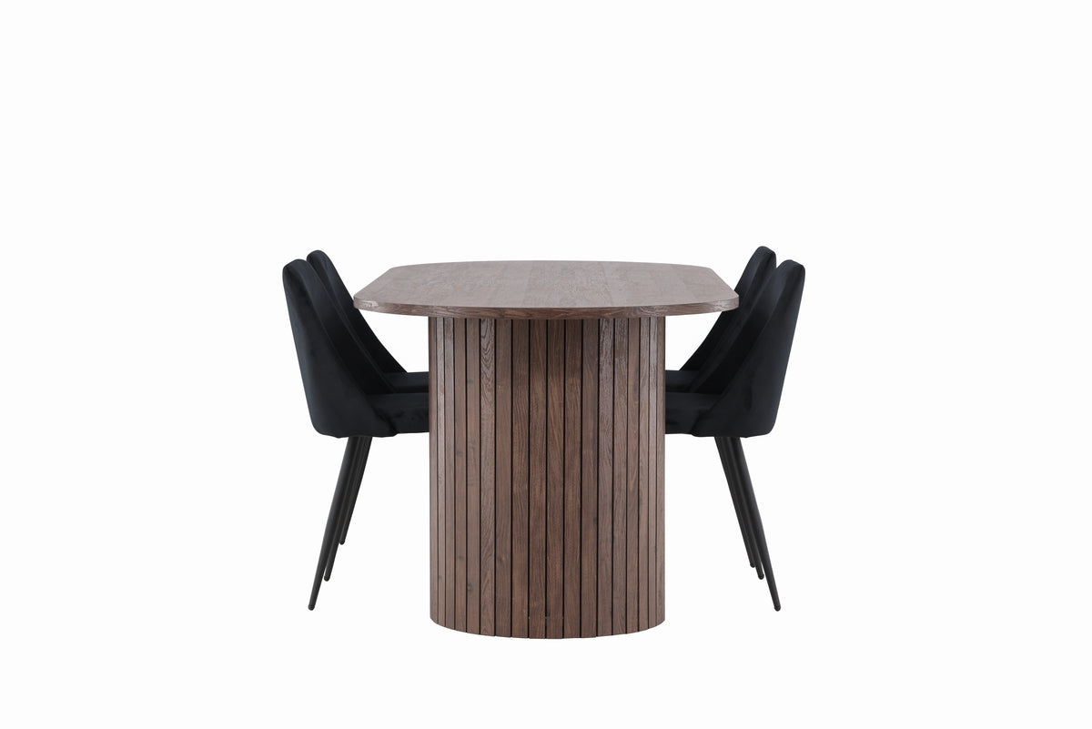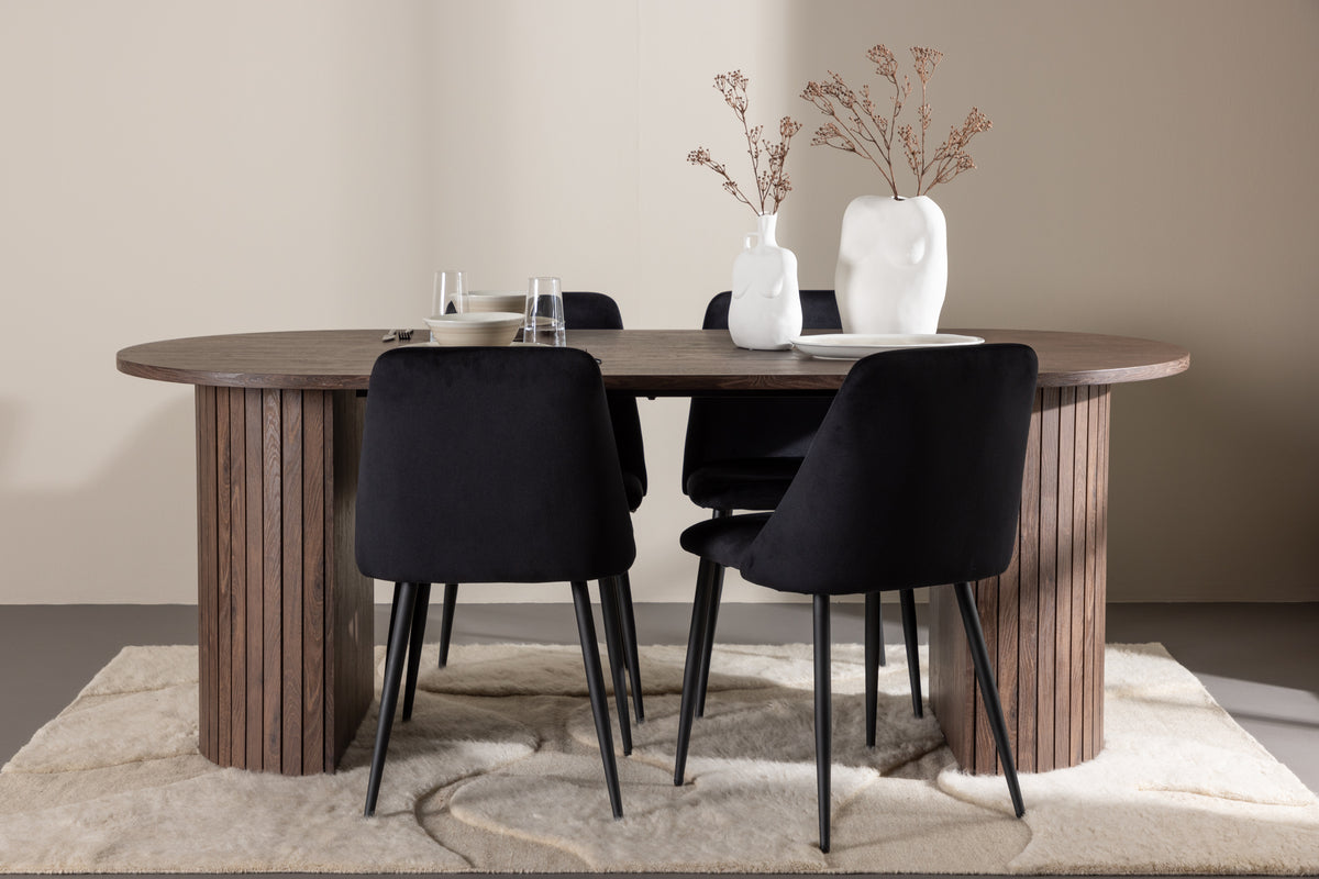 Upptäck den perfekta matgruppen med NIGHT matstolar och Härön matbordet - en kombination av stil, komfort och funktionalitet för ditt hem. Matstolarna från serien NIGHT är lika bekväma som stilrena, med en helklädd sits i svart sammetstyg och matchande svarta stolsben. Dessa stolar skapar ett lyxigt skimmer i rummet och bidrar till en inbjudande och modemedveten atmosfär. Det ska kännas skönt att slå sig ner för en smarrig måltid!