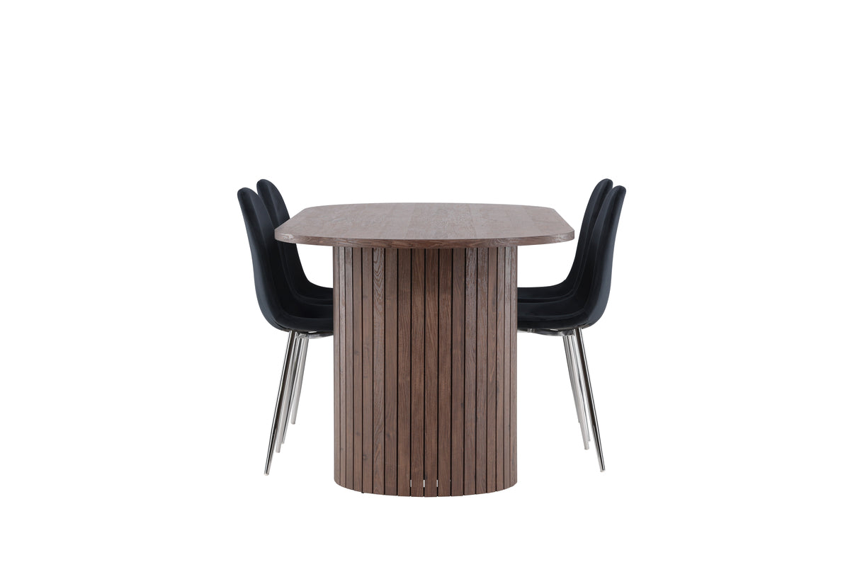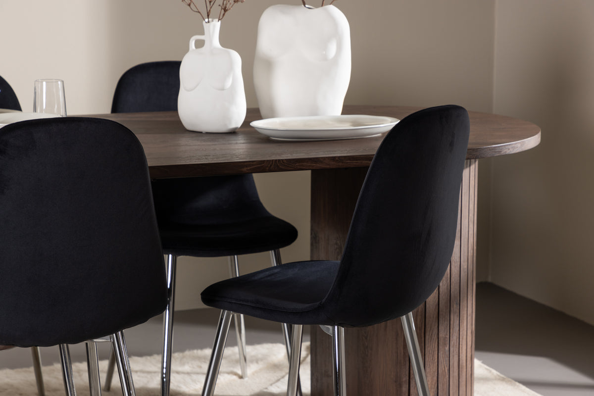 Upptäck den perfekta matgruppen med Polar matstolar och Härön matbordet - en kombination av lyx, komfort och elegans för ditt hem. Polar matstolar har en helklädd design med ben i kromad metall, en lätt rundad rygg och sits i smäckert svart sammetstyg med mjuk stoppning för extra komfort. Här slipper du kompromissa mellan bekvämlighet och design. Dessa stolar är perfekta att matcha med ett av våra snygga matbord för att skapa en komplett matgrupp till hemmets hjärta.