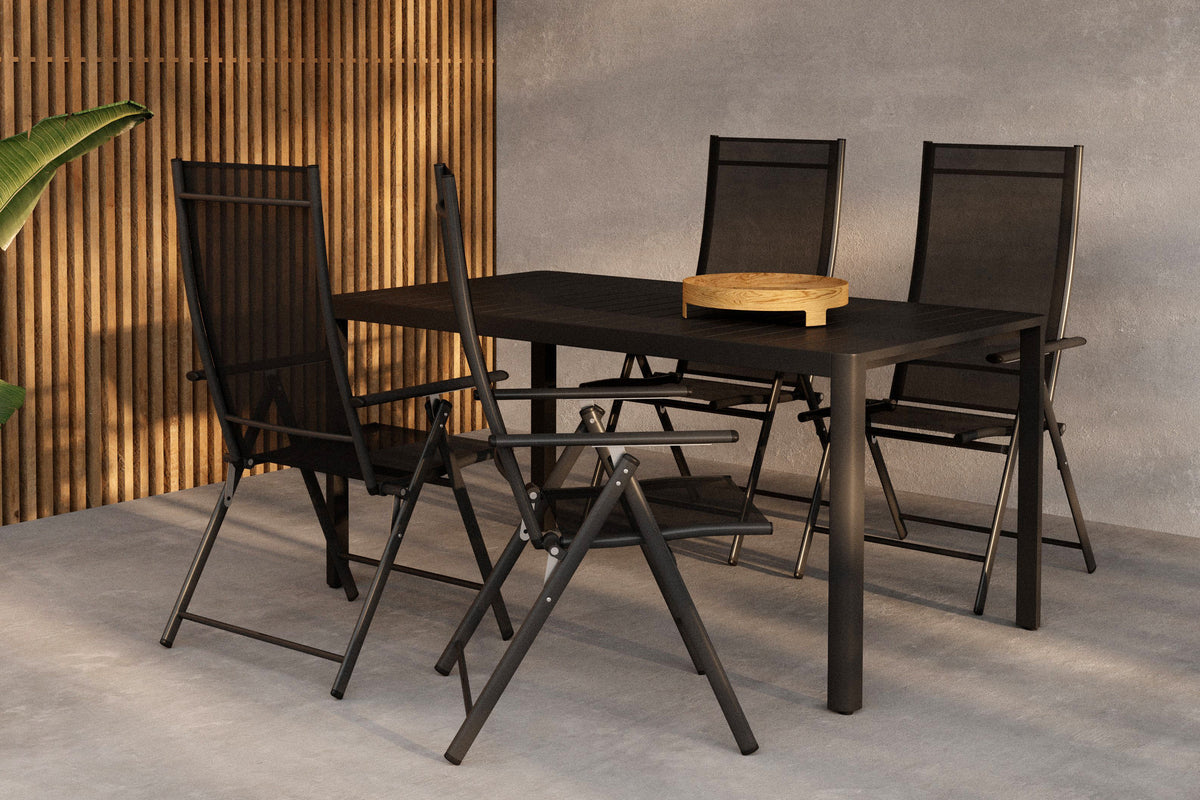 Skapa en modern och inbjudande matplats utomhus med Giardini matgrupp, bestående av Giardini matbord i svart aluminium och fyra Levanzo matstolar i svart stål och textilene. Den stilrena designen och hållbara materialen gör denna matgrupp perfekt för altanen, uteplatsen eller trädgården. Giardini Matbord är tillverkat i svart aluminium, ett lätt och rostbeständigt material som tål väder och vind. Den minimalistiska designen ger ett modernt och elegant uttryck, samtidigt som bordets stabila konstruktion säkerställer lång hållbarhet och enkel skötsel. Levanzo Matstol är en kombination av stil och komfort, med en robust ram i svart stål och en sits i slitstarkt textilene. Materialvalet gör stolen både vädertålig och lätt att underhålla, samtidigt som textilene-tyget ger en bekväm och luftig sittupplevelse. Den stilrena designen gör att stolen passar perfekt ihop med Giardini matbord och skapar en harmonisk helhet. Med sin tidlösa svarta färgsättning och slitstarka material är Giardini matgrupp ett utmärkt val för dig som vill ha en modern, hållbar och lättskött matgrupp för utomhusbruk.