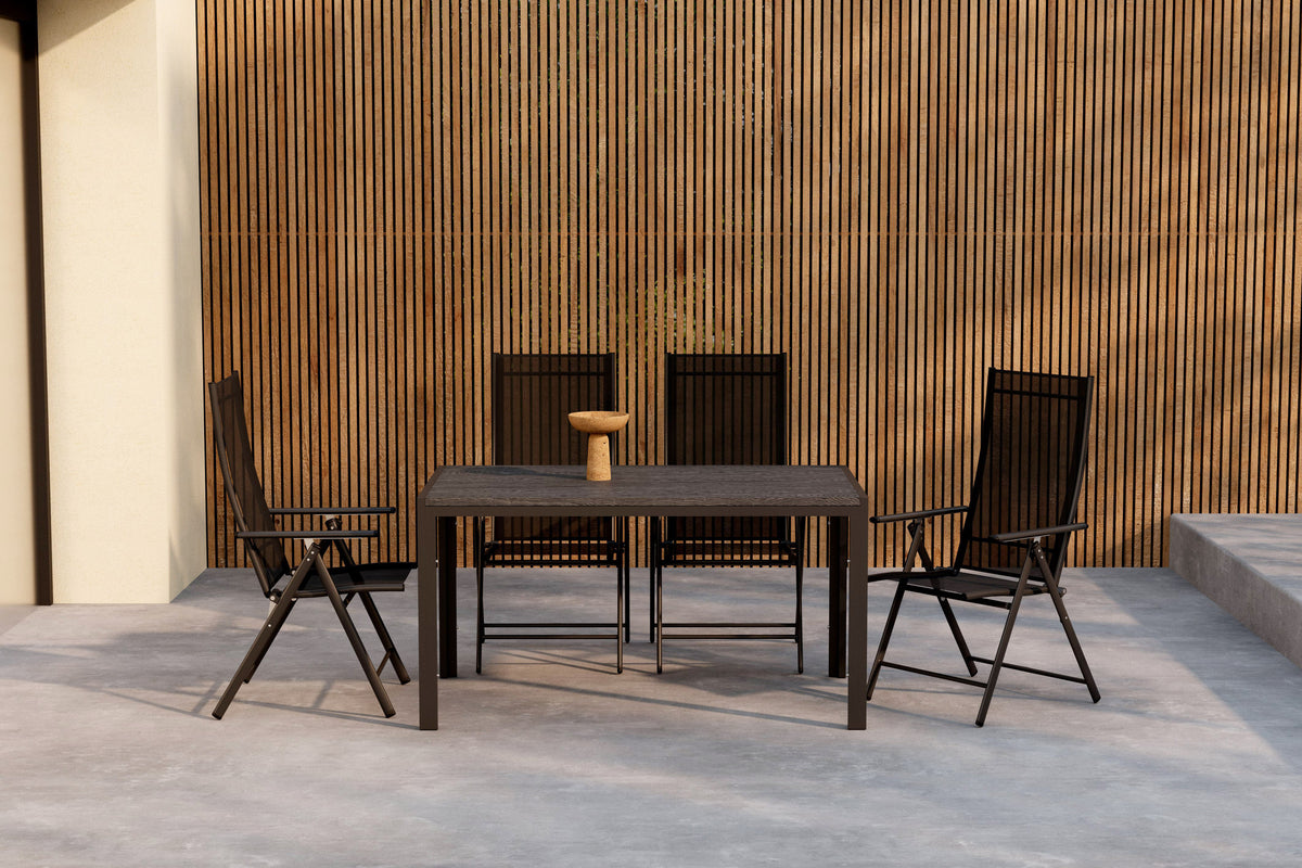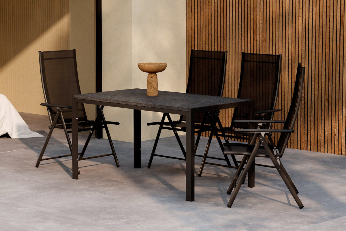 Skapa en stilfull och funktionell matplats utomhus med Mirko matgrupp, bestående av det eleganta Mirko matbordet och Levanzo matstolar. Kombinationen av svart aluminium, plywood och textilene ger en modern och sofistikerad känsla, perfekt för altanen, uteplatsen eller trädgården. Mirko Matbord har en elegant rektangulär design i svart aluminium, vilket gör det både lätt och robust. Bordsskivan i plywood ger en naturlig värme och en exklusiv känsla, samtidigt som den generösa storleken skapar gott om plats för trevliga måltider och sociala tillställningar. Aluminiumramen är rostbeständig och vädertålig, vilket gör bordet till ett hållbart och lättskött val för utomhusbruk. Levanzo Matstol är en praktisk och stilren stol med en ram i svart stål och en sits i slitstarkt textilene. Stolen är ihopfällbar, vilket gör den enkel att förvara och ta fram vid behov. Ryggstödet är dessutom justerbart, så att du kan anpassa stolen för optimal komfort – perfekt både vid middagar och för avkoppling i solen. Med Mirko matgrupp får du en kombination av modern design, smart funktionalitet och hög komfort, vilket gör den till ett perfekt val för dig som vill ha en elegant och flexibel matgrupp utomhus.