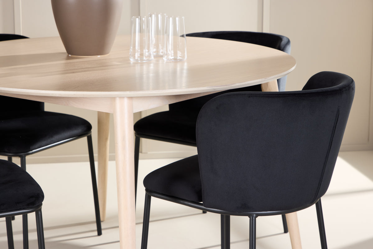 Uppgradera din matplats med den eleganta gruppen bestående av matbordet Flora och matstolarna Edina, där tidlös design och lyxig komfort möts för att skapa en harmonisk och inbjudande atmosfär i ditt hem. Matbordet Flora är ett stilfullt och funktionellt bord tillverkat i vittvättad fanerträ, vilket ger det en subtil och sofistikerad look. Den runda formen och en diameter på 120 cm gör det till ett perfekt val för att samla familj och vänner runt en gemensam måltid. Flora har en mjuk, neutral färgton som kompletterar alla inredningsstilar, från modern minimalism till klassisk elegans. Bordets naturliga trästruktur tillför en varm och inbjudande känsla, och den tidlösa designen skapar en trivsam och stilfull miljö för både vardagliga måltider och festliga tillfällen. Matstolarna Edina är den perfekta matchningen till Flora bordet, med sin sofistikerade design och lyxiga känsla. Klädda i svart sammet ger stolarna en rik och inbjudande atmosfär, där den djupa svarta nyansen tillför glamour och elegans till din matplats. Den mjuka sammetsklädseln ger en extra dimension av komfort och gör Edina-stolarna både vackra att se på och behagliga att sitta i. Den stadiga konstruktionen och den ergonomiska designen gör stolarna perfekta för långa middagar och sociala tillställningar, där både stil och funktionalitet går hand i hand. Tillsammans bildar Flora bordet och Edina-stolarna en harmonisk och stilfull matgrupp som förhöjer din inredning och skapar en inbjudande miljö. Låt denna eleganta kombination bli hjärtat i ditt hem, där varje måltid blir en njutbar och lyxig upplevelse.
