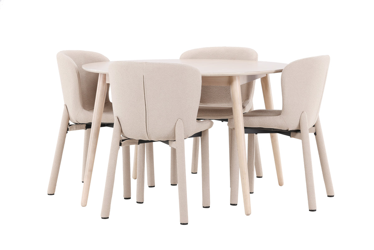 Matbordet Flora är tillverkat i vackert vittvättat fanerträ med en diameter på 120 cm, vilket ger gott om plats för att samla familj och vänner. Den runda formen uppmuntrar till samtal och skapar en känsla av närhet runt bordet. Den ljusa fanerytan framhäver träets naturliga struktur och skapar en subtil elegans som passar lika bra i moderna som klassiska miljöer. Tillsammans skapar Astoria och Flora en perfekt balans mellan sofistikerad design och funktionalitet. Den mjuka beige bouclén hos Astoria kompletterar Floras ljusa och inbjudande finish, vilket resulterar i en harmonisk och stilfull matplats.