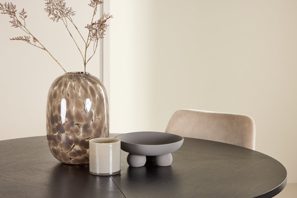 Matbordet Strada kombinerar modern design med funktionalitet. Tillverkat i svart fanerträ, ger det en tidlös och elegant känsla som smälter in i många olika inredningsstilar. Med en ursprunglig diameter på 120 cm erbjuder bordet en intim matplats, men det kan enkelt förlängas till 170 cm för att ge extra utrymme när du har gäster. Den smidiga förlängningsfunktionen gör det enkelt att anpassa bordet efter dina behov. Den mörka ytan på bordsskivan skapar en vacker kontrast i rummet och framhäver de rena linjerna och den sofistikerade designen. Matstolarna Night är klädda i mjuk beige sammet, vilket ger en inbjudande och behaglig sittupplevelse. Den neutrala beige tonen tillför en känsla av sofistikerad elegans och passar perfekt in i både moderna och klassiska inredningar. De svarta benen skapar en distinkt kontrast till den ljusa sammetssitsen och ger stolen en stabil och elegant profil. Den ergonomiska designen ger bra stöd för ryggen, vilket gör stolen perfekt för långa, avkopplande middagar.