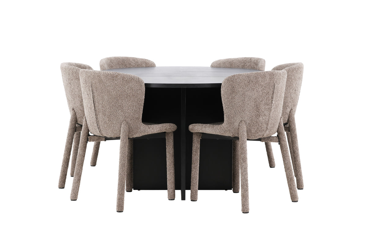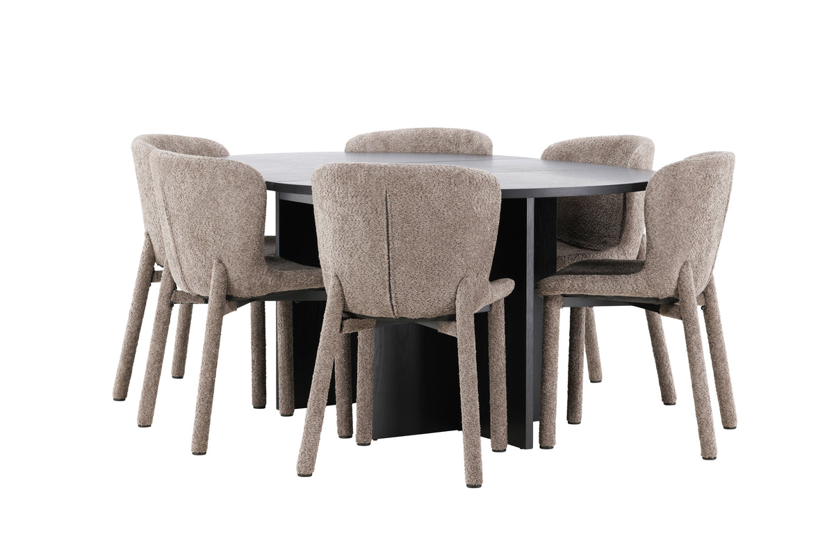 Skapa en elegant och inbjudande matplats med matstolen Astoria och matbordet Strada – en perfekt kombination av sofistikerad komfort och tidlös design. Förhöj din matplats med matstolen Astoria, klädd i elegant brun bouclé. Den mjuka, texturerade ytan ger stolen en lyxig och omfamnande känsla, samtidigt som färgens djup och struktur smälter vackert in i både moderna och klassiska inredningsstilar. Astoria är designad för att kombinera estetik med komfort: det ergonomiska ryggstödet och den generösa stoppningen i sitsen gör stolen idealisk för långa, avkopplande måltider med familj och vänner. Den genomtänkta designen gör Astoria till en naturlig och stilfull mittpunkt i ditt matrum. Matbordet Strada kombinerar modern flexibilitet med elegant design och är tillverkat i stilrent svart fanerträ. Bordet har en ursprunglig diameter på 120 cm, vilket skapar en inbjudande och intim matplats. För större tillställningar kan bordet enkelt förlängas till 170 cm, vilket ger extra plats utan att kompromissa med stil. Den svarta ytan skapar en vacker kontrast i rummet och framhäver bordets rena linjer och sofistikerade utseende. Den smidiga förlängningsfunktionen gör Strada till ett mångsidigt val för både vardag och fest. Tillsammans skapar matstolen Astoria och matbordet Strada en sofistikerad och funktionell matplats som passar alla tillfällen. Astorias varma, bruna bouclé och Stradas svarta fanerträ kompletterar varandra perfekt och tillför en stilfull balans i ditt hem. Låt denna kombination bli en central del av ditt matrum, där design, komfort och funktion möts för att förhöja varje måltid.