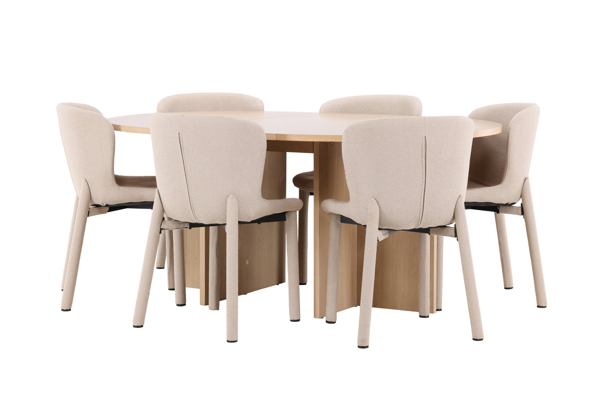 Skapa en sofistikerad och flexibel matplats med matstolen Astoria och matbordet Strada. Förhöj din matplats med en kombination av tidlös elegans, komfort och praktisk funktion. Matstolen Astoria och matbordet Strada kompletterar varandra perfekt och skapar en inbjudande atmosfär som passar både vardagens måltider och festliga sammankomster. Matstolen Astoria är klädd i lyxig beige bouclé som ger en varm och sofistikerad känsla till ditt matrum. Boucléns mjuka struktur och neutrala ton gör stolen enkel att matcha med olika inredningsstilar – från modern minimalism till klassisk elegans. Den ergonomiska utformningen med stödjande ryggstöd och generös stoppning i sitsen erbjuder maximal komfort, vilket gör Astoria idealisk för långa och avkopplande middagar med familj och vänner.