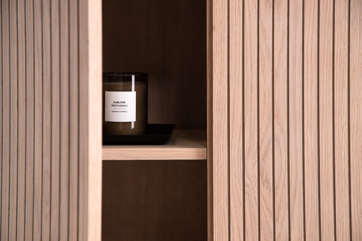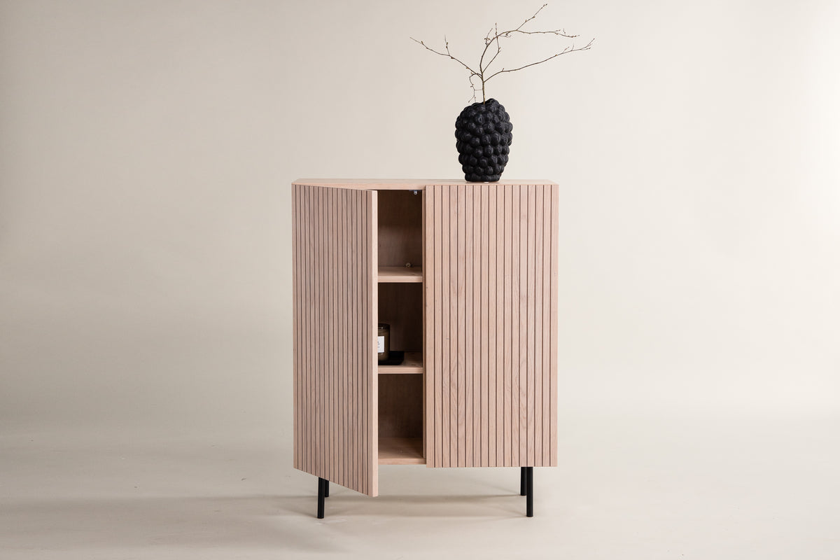 En lika snygg som smart förvaringslösning till ditt hem! Det här höga avlastninsgskåpet från serien Björkön finns i olika kulörer och storlekar och klättrar snabbt på trendlistorna med sin stilsäkra design. Skåpet har två luckor i ribbad look och tre hyllplan för dold förvaring. Tillverkat i vitputsade faner och lyfts upp av smal ben i svart stål. Placera som sidobord med vackra dekorationer och ljusstakar eller som dolt vitrinskåp - bara fantasin sätter gränser!